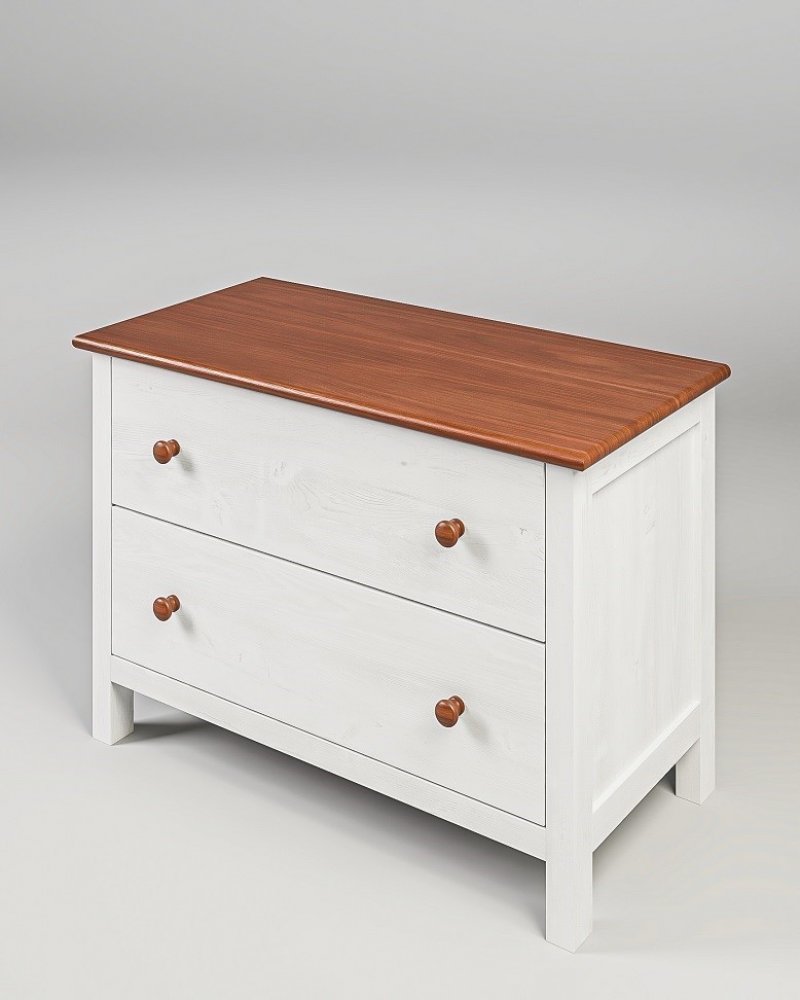 Komoda II. velká Anny Dřevěná komoda se dvěma zásuvkami v bílo-hnědém provedení. Kód: 245 Dřevěná komoda II.velká Anny Dřevěný nábytek, rozměr: 90x45x64 cm. Řada nábytku Anny v bílo-hnědém provedení je vhodná do vaší ložnice, ale také k vybavení chaty či chalupy. Záda komody - sololak. Materiál: smrk Barva: bílo-hnědá Balení: v demontovaném stavu Počet balíků: 1