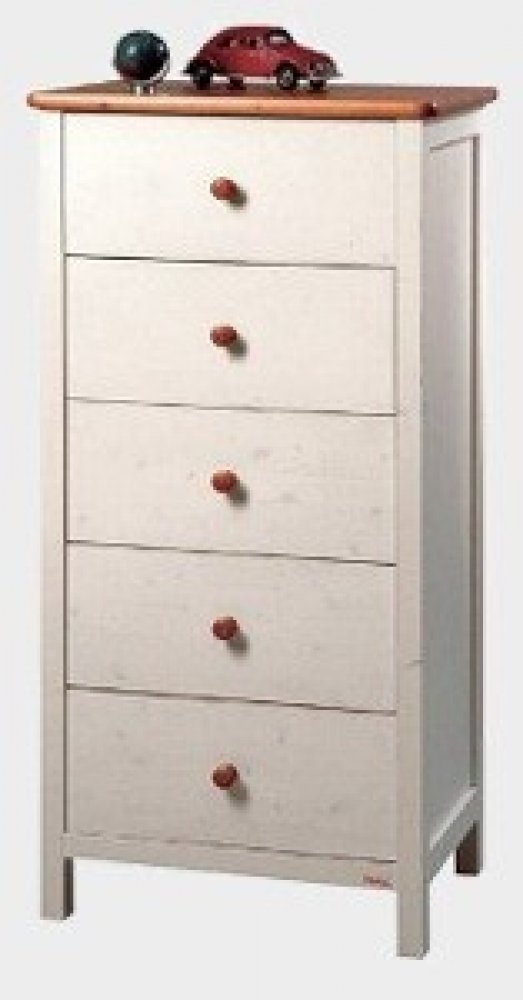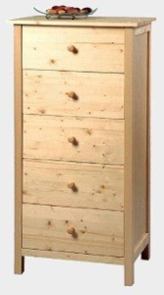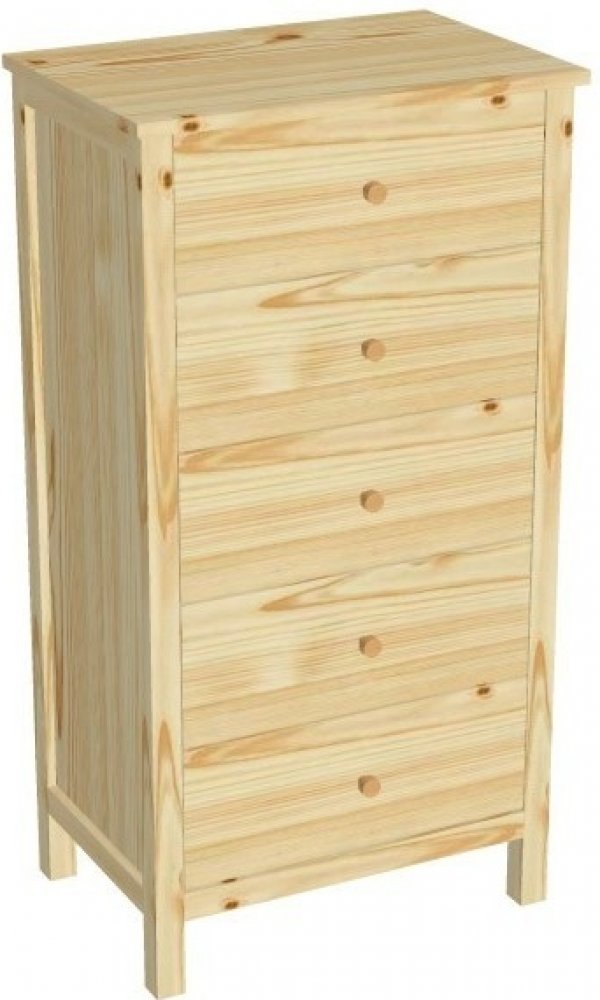 Komoda V malá Natur je pětizásuvková úzká komoda. Vyrobena ze smrkového masivu, boky komody jsou ze smrkové překližky. Ošetřena bezbarvým lakem.