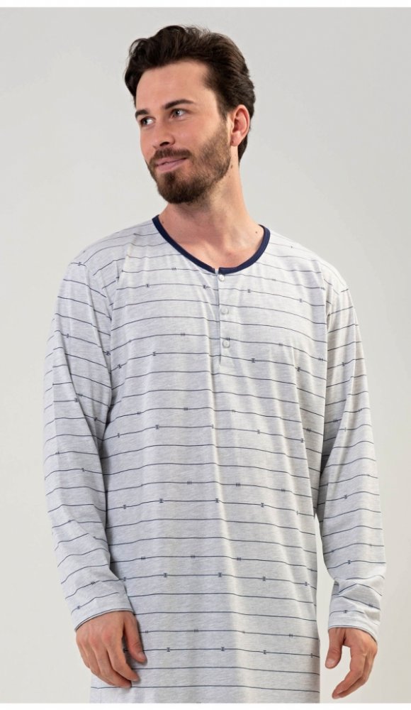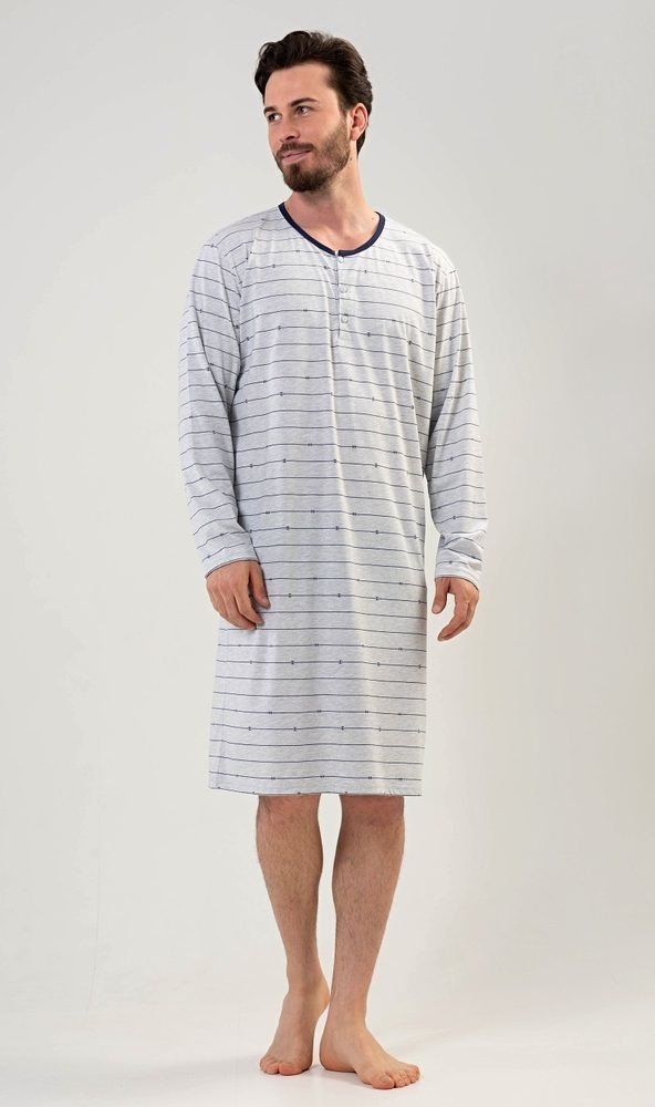 Pánská noční košile s dlouhým rukávem Filip.Pánská noční košile s dlouhým rukávem Flip. Pánská noční košile s dlouhým rukávem je určena pro všechny milovníky pohodlí. Košile má výstřih zakončený légou s knoflíčky. Výstřih a potisk v podobě proužků je v kontrastní tmavě modré barvě. Použitý materiál je příjemný a poddajný na dotek.Pokyny pro údržbu:- 70% bavlna, 30% polyester- lze prát v pračce při teplotě do 30°- nesušit v sušičce- žehlit z rubu do 110°- nepoužívat bělící prostředky- nečistit chemickyMíry naměřené na výrobku:0021271958 FilipMLXLXXLobvod hrudníku116122126128délka košile111111111111
