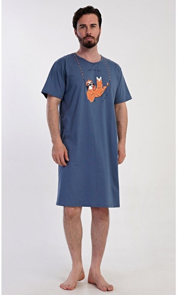 Pánská noční košile Pohodář je skvělou volbou pro muže, kteří hledají pohodlí a styl. Vyrobena ze 100% bavlny, je příjemná, poddajná a prodyšná, takže zajišťuje maximální komfort při spánku i domácím odpočinku.Košile má krátký rukáv, kulatý výstřih a pohodlnou délku po kolena. Jednobarevný design doplňuje originální obrázek lenochoda v houpací síti na hrudi, který dodává odlehčený a hravý nádech. ...