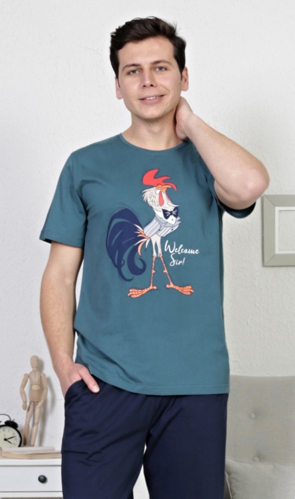 Pánské kapri pyžamo Kohout.Pánské bavlněné kapri pyžamo Kohout. Pánské pyžamo se skládá z trička s krátkým rukávem a tříčtvrtečních kalhot. Na jednobarevném tričku je vtipný obrázek kohouta ve fraku s nápisem 'Welcome, sir!'. Tričko vhodně doplňují jednobarevné kalhoty pod kolena, které mají v pase gumu, šňůrku na stažení a praktické kapsy. Použitý materál s obsahem bavlny 100% je příjemný a podda...