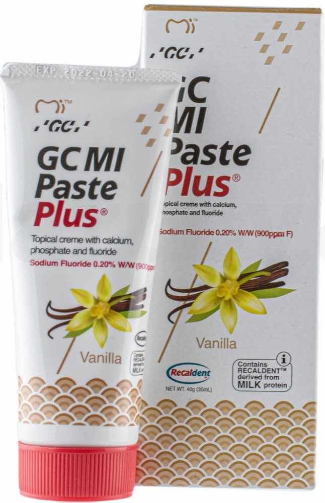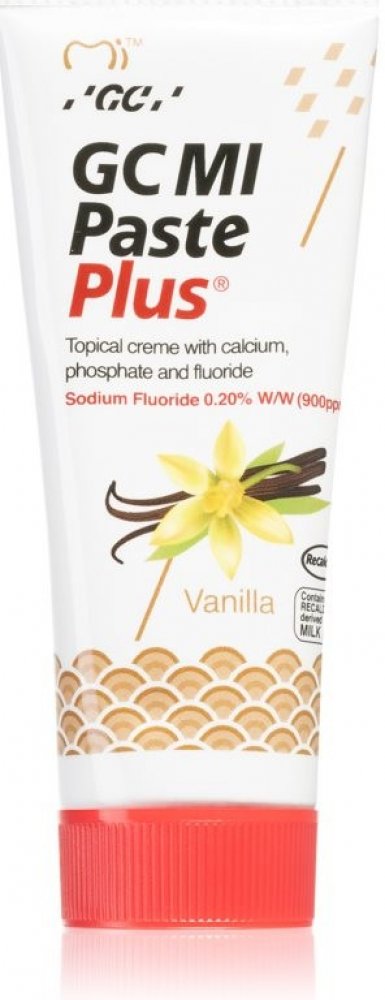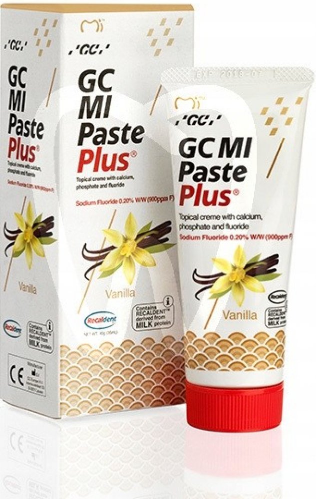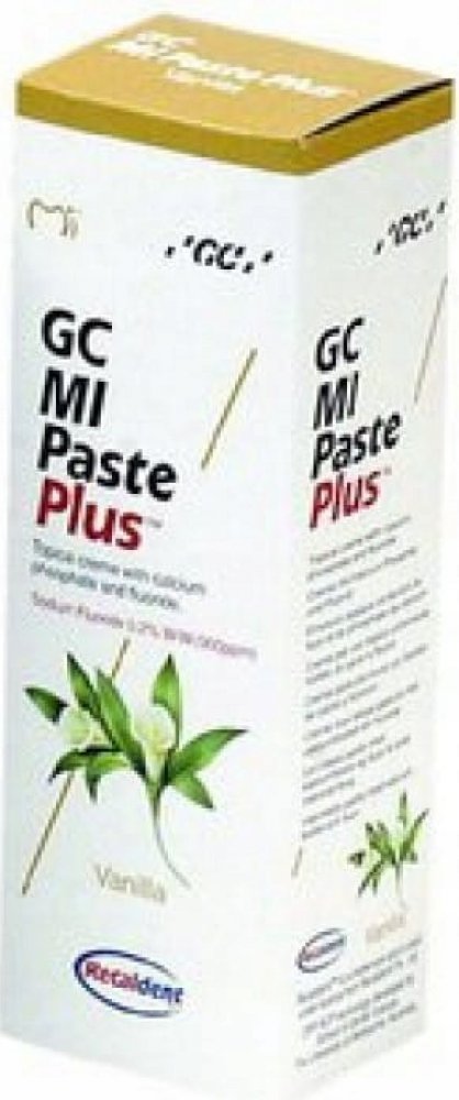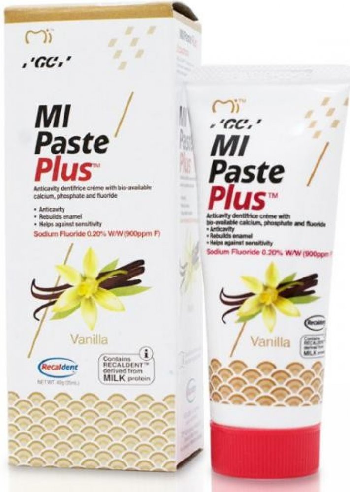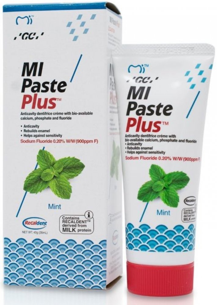 GC MI Paste Plus je topický dentální krém s obsahem vápníku, fosfátu a fluoridů. Používá se ke zvýšení pevnosti, odolnosti a zdraví zubů. Vhodné pro pacienty s rozsáhlým zubním kazem a zvýšenou abrazí zubů. Dodává zubům potřebné látky k remineralizaci povrchu zubů. Je velice účinný a zubaři také hojně doporučovaný, protože obsahuje RECALDENT™ (CPP-ACP), speciální protein získávaný z mléka, který pomáhá při nahrazování ztracených minerálů v zubech, takže jim zabraňuje v erozi a následném rozpadu.