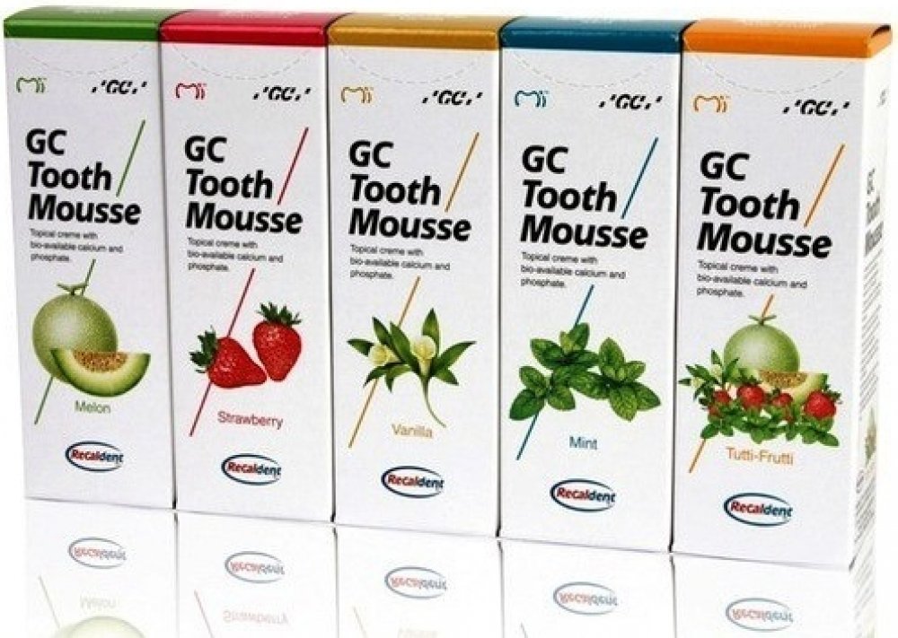 GC TOOTH MOUSSE je bioaktivní dentální ochranný krém, který obsahuje recaldent - vápník a fosfát. Neobsahuje cukr. Díky tomu, že neobsahuje také fluorid, je vhodný i pro děti do 6 let. Místo fluoridu je v něm obsažen již zmíněný recaldent, který se získává z mléčného kaseinu (CPP-ACP). Aktivně pomáhá obnovit minerální rovnováhu v ústech.