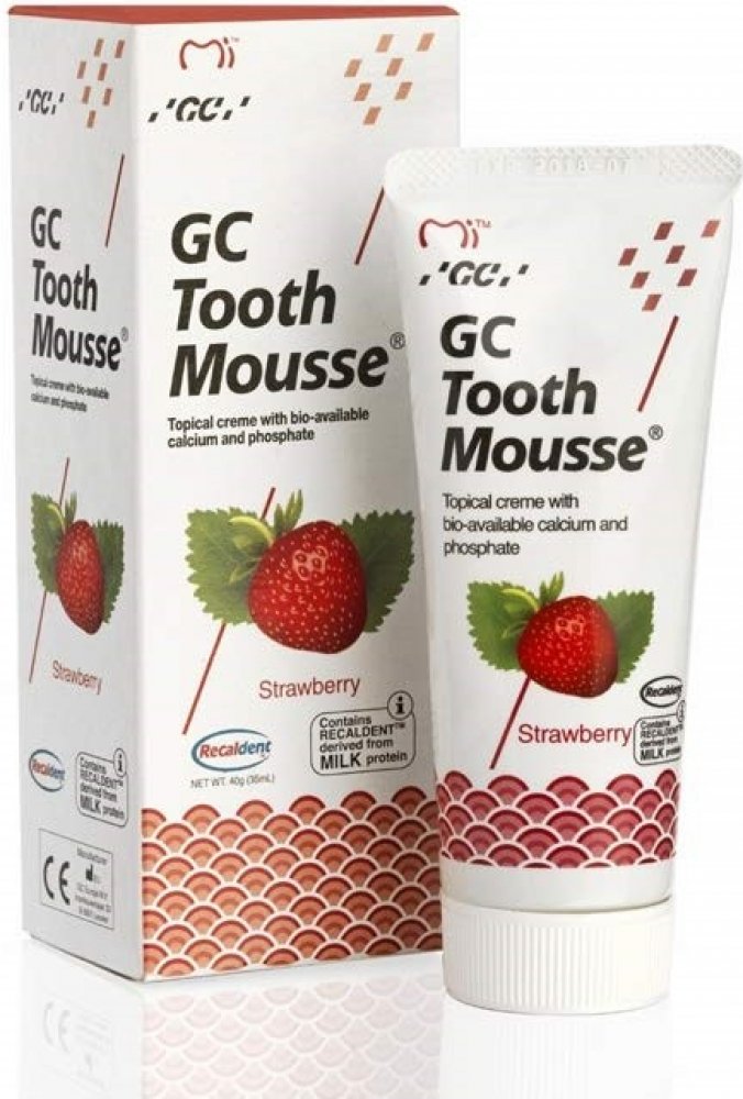 GC Tooth Mousse je dentální krém na bázi vody. Obsahuje formuli RECALDENT, což je derivát mléčného proteinu, kaseinu: CPP-ACP: Casein Phosphopeptide – Amorphous Calcium Phosphate. Při aplikaci v ústech se CPP-ACP naváže k zubnímu plaku, bakteriím, hydroxyapatitu a okolním měkkým tkáním a dodává lokálně potřebný vápník a fosfát.