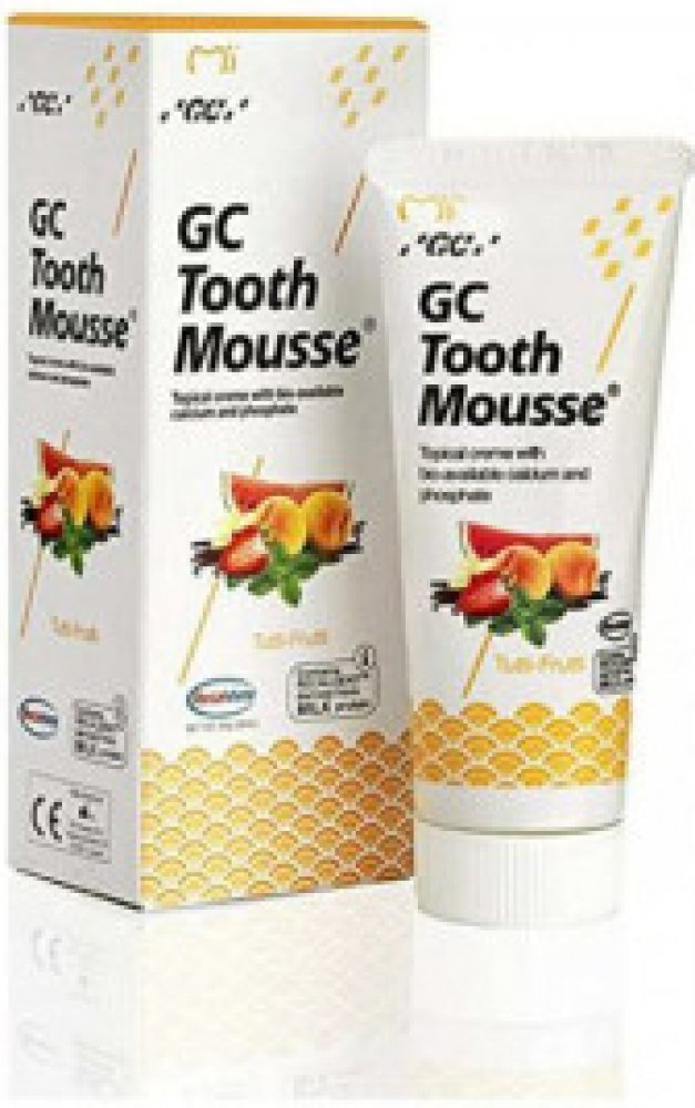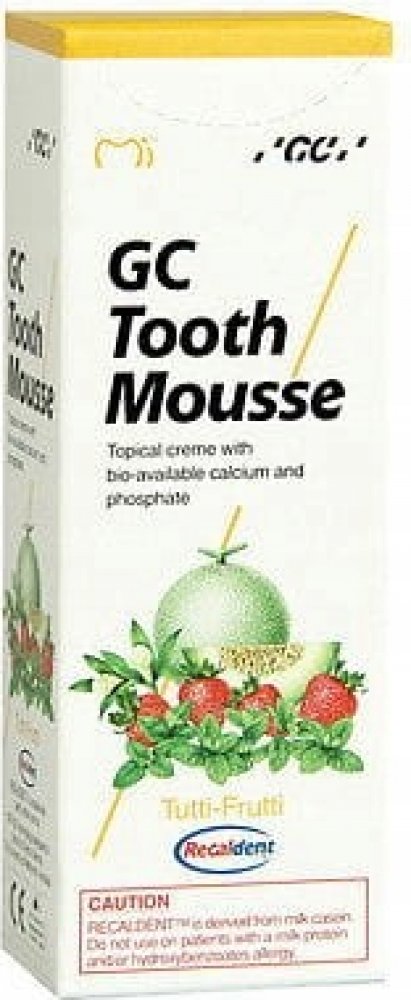 GC Tooth Mousse dentální krém s formulí RECALDENT, která obsahuje CPP-ACP (Casein Phosphopeptide – Amorphous Calcium Phosphate). Při aplikaci v ústech se CPP-ACP naváže na zubní plak a dodává lokálně potřebný vápník a fosfát.GC Tooth Mousse dentální krémBIOAKTIVNÍ DENTÁLNÍ KRÉM S VÁPNÍKEM A FOSFÁTY