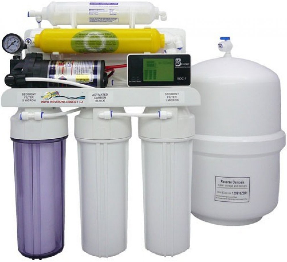 Šestistupňová mikroprocesorem řízená jednotka se zásobníkem, mineralizátorem, posilovacím čerpadlem a výdejním kohoutkem výkon 50GPD až 190 litrů za den.