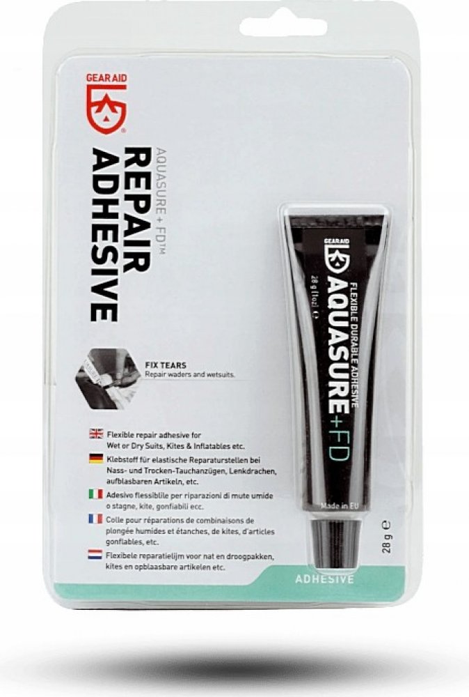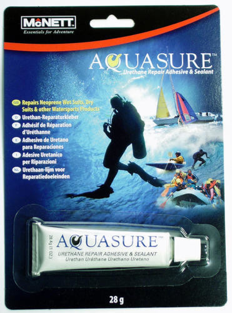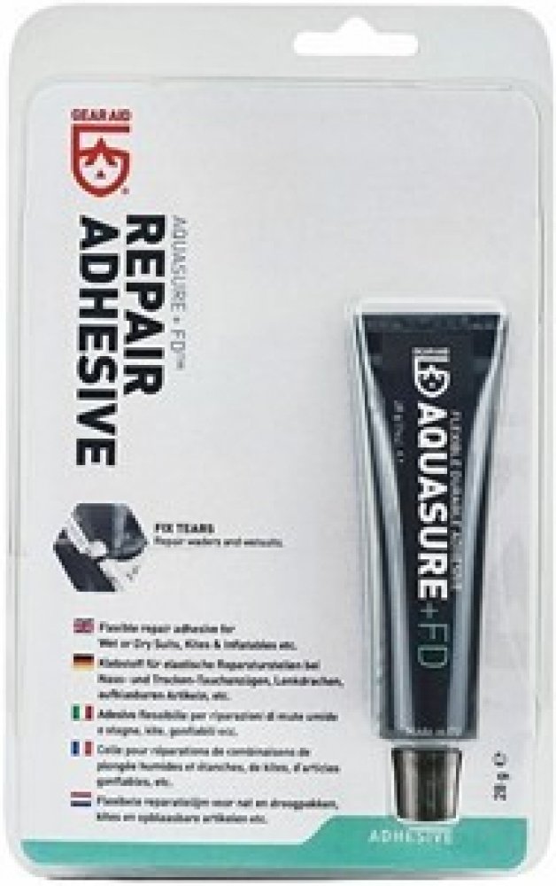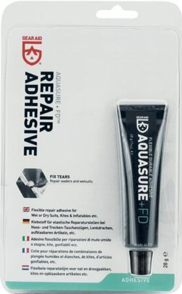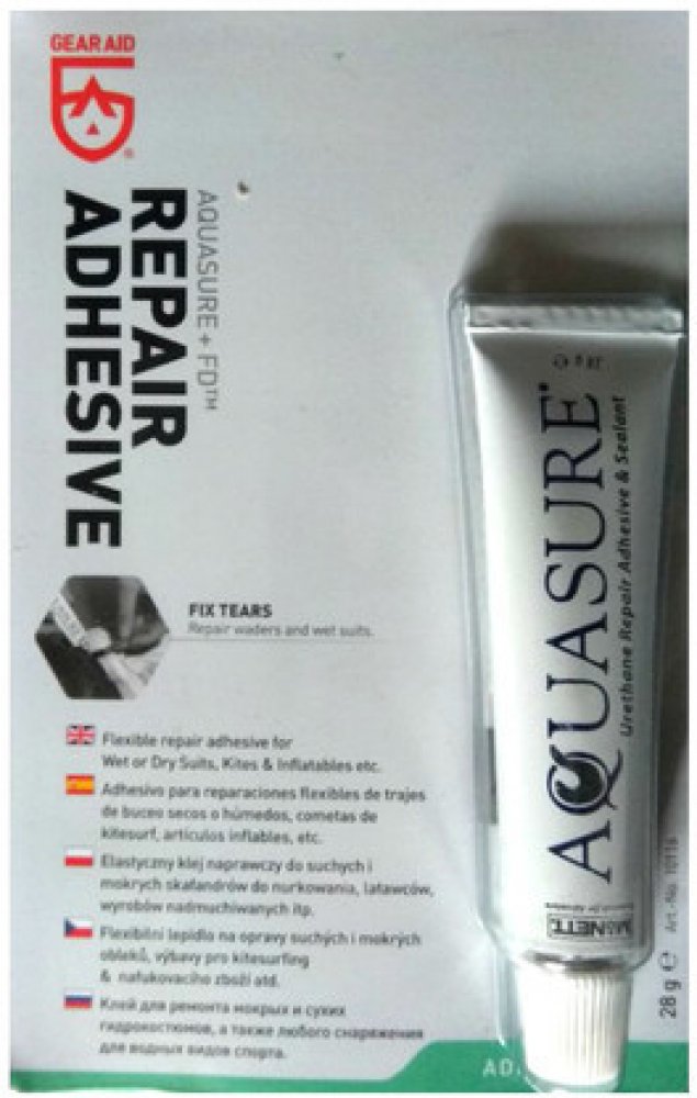 AQUASURE+FD je lepidlo/tmel na bázi polyuretanu pro opravu středně těžkých zátěrovaných tkanin (Cordury) a neoprenu.