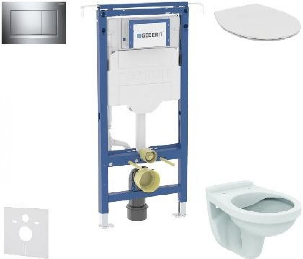 Set předstěnové instalace, klozetu a sedátka Ideal Standard, tlačítka Sigma20, chrom Obsahuje Předstěnový instalační prvek Geberit Duofix, se splachovací nádržkou pod omítku, k instalaci mezi boční stěny Soupravu pro tlumení hluku Keramický závěsný klozet Ideal Standard Alpha Duroplastové WC sedátko Ideal Standard SoftClose pozvolné, tiché sklápění 2-činné ovládací tlačítko Geberit Sigma20, barva: chrom Montážní prvek Duofix pro závěsné WC se splachovací nádržkou pod omítku Sigma 12 cm, k instalaci mezi boční stěny Specifikace montáže Do podlahy je prvek ukotven pomocí dvou podpěr, které jsou plynule výsuvné a tím umožňují individuální nastavení výšky WC mísy. To ocení při dosedání a vstávání zvláště vyšší, starší a zdravotně handicapovaní lidé. Výsuvné vodorovné rozpěry zabezpečí jednoduchou a spolehlivou montáž i v různých šířkách místnosti. Případná demontáž ventilů (napouštěcího a vypouštěcího) je snadná díky dostatečně velkému servisnímu otvoru skrytému za ovládacím tlačítkem. Opláštění i s obkladem lze připevnit přímo na rám prvku a tak nedochází ke zbytečnému zmenšení prostoru WC. Konstrukce prvku Duofix dovoluje provést montáž takovým způsobem, aby byla možná jeho demontáž, např. v případě rekonstrukce stoupacích potrubí v instalační šachtě. Duofix má veškeré vývody pro napojení odpadu,vody a zařizovacího předmětu pevně fixovány, což zjednodušuje montáž a omezuje možnost chybného napojení na minimum. Účel použití Pro kovové a dřevěné sloupkové stěny K montáži do čelních stěn částečně vysokých nebo vysokých na výšku místnosti K montáži do úzkých prostor a výklenků Pro tloušťky podlahy 0–25 cm Pro závěsná WC Vlastnosti Staticky samonosný rám, chráněný proti korozi práškovým potahem Nastavitelný do šířky Rám pro závěsná WC s připojovacími rozměry dle EN 33 a vyložením až 70 cm Alternativní montážní poloha pro nástěnné kotvy Patní desky lze otáčet, vhodné pro montáž do U profilů UW 50 a UW 75 Pozinkované podpěry, chráněné proti korozi, s protiskluzovými vlastnostmi Připojovací koleno pro montáž bez nářadí v různých hloubkách, rozsah nastavení 45 mm Splachovací nádržka pod omítku Geberit Sigma 12 cm, s izolací proti orosování Pro ovládání zepředu, vhodné pro 1 množství splachování, 2 množství splachování a splachování Start/Stop U nastavení z výroby je možné okamžité dodatečné spláchnutí Montážní a servisní práce na splachovací nádržce pod omítku bez nářadí Přívod vody vzadu nebo nahoře uprostřed Kryt pro hrubou montáž pro servisní otvor s možností zkrácení, chrání před vlhkostí a nečistotami S trubkovou chráničkou pro přívodní potrubí vody pro sprchovací WC Geberit AquaClean a pro připojovací kabel Možnost upevnění pro přívod elektřiny a Power & Connect Box Technické údaje Tlak při průtoku: 10-1000 kPa Maximální teplota vody: 25 °C Splachovací množství, nastavení ve výrobě: 6 a 3 l Velké splachovací množství, rozsah nastavení: 4 / 4.5 / 6 / 7.5 l Malé splachovací množství, rozsah nastavení: 3-4 l Obsah dodávky Přívod vody R 1/2", vhodný pro MasterFix a MeplaFix, s integrovaným rohovým ventilem a ručním ovládacím kolečkem Kryt pro hrubou montáž pro servisní otvor Připojovací souprava pro WC, Ø 90 mm Připojovací koleno 90° z PE-HD, Ø 90 mm Přechodka z PE-HD, Ø 90 / 110 mm Upevňovací a ochranný materiál Závěsný klozet Ideal Standard Alpha Rozměry: 355 x 520 mm Materiál: sanitární keramika Rimless splachovací technologie Ovládací tlačítko Sigma20, pro 2 množství splachování Rozměry: 246 x 164 mm Materiál: plast Barva provedení: chrom K ovládání splachování u splachovacích nádržek pod omítku Geberit Sigma Upevňovací rámeček 2 stavitelné úchytky 2 tyčky tlačítka Tyčky tlačítka jsou zvukově izolované, rychlé nastavení bez nářadí