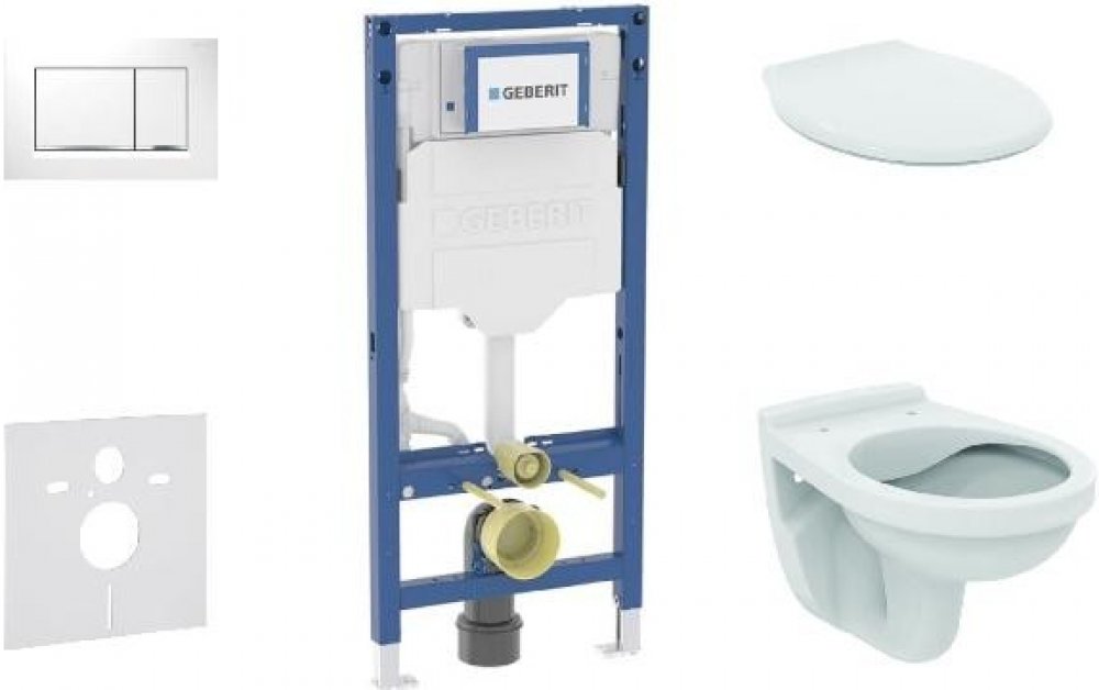 Set předstěnové instalace, klozetu a sedátka Ideal Standard, tlačítka Sigma30, bílá/chrom Obsahuje předstěnový instalační prvek Geberit Duofix, se splachovací nádržkou pod omítku soupravu pro tlumení hluku keramický závěsný klozet Ideal Standard Alpha ultratenké duroplastové WC sedátko Ideal Standard 2-činné ovládací tlačítko Geberit Sigma30, barva bílá/chrom Tento instalační set je dostupný v dalších variantách provedení ovládacího tlačítka. Montážní prvek Duofix pro závěsné WC se splachovací nádržkou pod omítku Sigma 12 cm Účel použití pro konstrukce prováděné suchým procesem k montáži do předstěnových instalací částečně vysokých nebo vysokých na výšku místnosti k montáži do instalačních stěn vysokých na výšku místnosti k montáži do systémových stěn Geberit Duofix částečně vysokých nebo vysokých na výšku místnosti pro závěsná WC s připojovacími rozměry podle EN 33 a přesahem do 70 cm pro 1-činné, 2 -činné nebo Start/Stop splachování pro tloušťky podlahy 0–25 cm Vlastnosti samonosný rám s nanesenou práškovou barvou rám připravený pro podpěry u WC keramik s malou opěrnou plochou podpěry pozinkované podpěry s protiskluzovou úpravou patní desky otočné, vhodné pro montáž do U-profilů UW 50 a UW 75 připojovací koleno pro montáž bez nářadí v různých hloubkách, rozsah nastavení 45 mm splachovací nádržka pod omítku izolovaná proti orosování u nastavení z výroby je možné okamžité dodatečné spláchnutí montážní a servisní práce na splachovací nádržce pod omítku bez nářadí přívod vody vzadu nebo nahoře uprostřed kryt pro hrubou montáž pro servisní otvor chrání před vlhkostí a nečistotami kryt pro hrubou montáž pro servisní otvor s možností zkrácení vybaven trubkovou chráničkou pro přívodní potrubí k připojení sprchovacích WC Geberit AquaClean s možností upevnění pro přívod elektřiny Technické údaje tlak při průtoku: 10-1000 kPa maximální teplota vody: 25 °C splachovací množství, nastavení ve výrobě: 6 a 3 l velké splachovací množství, rozsah nastavení: 4 / 4.5 / 6 / 7.5 l malé splachovací množství, rozsah nastavení: 2-4 l výpočtový průtok: 0.09 l/s minimální přetlak pro výpočtový průtok: 10 kPa Obsah dodávky přívod vody R 1/2", vhodný pro MF, s integrovaným rohovým ventilem a ručním ovládacím kolečkem kryt pro hrubou montáž pro servisní otvor připojovací souprava pro WC, O 90 mm připojovací koleno 90° z PE-HD, O 90 mm přechodka z PE-HD, O 90 / 110 mm upevňovací materiál Stavební souprava pro předstěnovou montáž není součástí balení. Závěsný klozet Ideal Standard Alpha rozměry: 355 x 520 mm materiál: sanitární keramika Rimless splachovací technologie Ovládací tlačítko Sigma30, pro 2 množství splachování rozměry: 246 x 164 mm materiál: plast barva provedení: bílá/chrom k ovládání splachování u splachovacích nádržek pod omítku Geberit Sigma upevňovací rámeček 2 stavitelné úchytky 2 tyčky tlačítka tyčky tlačítka jsou zvukově izolované, rychlé nastavení bez nářadí Stavební souprava pro předstěnovou montáž není součástí dodávky, je třeba objednat zvlášť.