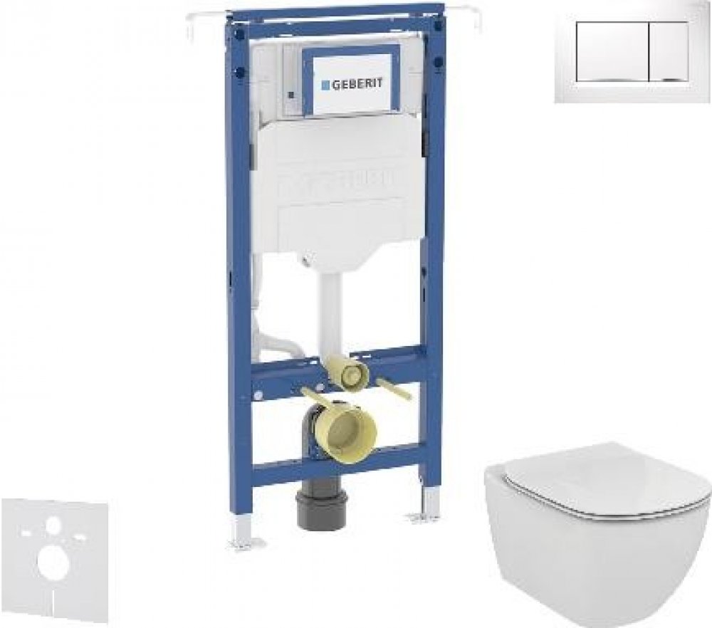 Kompletní instalační set pro závěsné WC Obsahuje Předstěnový instalační prvek Geberit Duofix, se splachovací nádržkou pod omítku Sigma 12 cm, k instalaci mezi boční stěny Soupravu pro tlumení hluku Závěsné WC Ideal Standard Tesi s inovativní technologií splachování AQUABLADE Ultraploché WC sedátko Ideal Standard Tesi s mechanismem pozvolného sklápění sedátka SoftClose 2-činné ovládací tlačítko Geberit Sigma20, bílá/chrom Montážní prvek Duofix pro závěsné WC se splachovací nádržkou pod omítku Sigma 12 cm Specifikace montáže Do podlahy je prvek ukotven pomocí dvou podpěr, které jsou plynule výsuvné a tím umožňují individuální nastavení výšky WC mísy. To ocení při dosedání a vstávání zvláště vyšší, starší a zdravotně handicapovaní lidé. Výsuvné vodorovné rozpěry zabezpečí jednoduchou a spolehlivou montáž i v různých šířkách místnosti. Případná demontáž ventilů (napouštěcího a vypouštěcího) je snadná díky dostatečně velkému servisnímu otvoru skrytému za ovládacím tlačítkem. Opláštění i s obkladem lze připevnit přímo na rám prvku a tak nedochází ke zbytečnému zmenšení prostoru WC. Konstrukce prvku Duofix dovoluje provést montáž takovým způsobem, aby byla možná jeho demontáž, např. v případě rekonstrukce stoupacích potrubí v instalační šachtě. Duofix má veškeré vývody pro napojení odpadu, vody a zařizovacího předmětu pevně fixovány, což zjednodušuje montáž a omezuje možnost chybného napojení na minimum. Účel použití Pro kovové a dřevěné sloupkové stěny K montáži do čelních stěn částečně vysokých nebo vysokých na výšku místnosti K montáži do úzkých prostor a výklenků Pro tloušťky podlahy 0–25 cm Pro závěsná WC Vlastnosti Staticky samonosný rám, chráněný proti korozi práškovým potahem Nastavitelný do šířky Rám pro závěsná WC s připojovacími rozměry dle EN 33 a vyložením až 70 cm Alternativní montážní poloha pro nástěnné kotvy Patní desky lze otáčet, vhodné pro montáž do U profilů UW 50 a UW 75 Pozinkované podpěry, chráněné proti korozi, s protiskluzovými vlastnostmi Připojovací koleno pro montáž bez nářadí v různých hloubkách, rozsah nastavení 45 mm Splachovací nádržka pod omítku Geberit Sigma 12 cm, s izolací proti orosování Pro ovládání zepředu, vhodné pro 1 množství splachování, 2 množství splachování a splachování Start/Stop U nastavení z výroby je možné okamžité dodatečné spláchnutí Montážní a servisní práce na splachovací nádržce pod omítku bez nářadí Přívod vody vzadu nebo nahoře uprostřed Kryt pro hrubou montáž pro servisní otvor s možností zkrácení, chrání před vlhkostí a nečistotami S trubkovou chráničkou pro přívodní potrubí vody pro sprchovací WC Geberit AquaClean a pro připojovací kabel Možnost upevnění pro přívod elektřiny a Power & Connect Box Technické údaje Tlak při průtoku: 10-1000 kPa Maximální teplota vody: 25 °C Splachovací množství, nastavení ve výrobě: 6 a 3 l Velké splachovací množství, rozsah nastavení: 4 / 4.5 / 6 / 7.5 l Malé splachovací množství, rozsah nastavení: 3-4 l Obsah dodávky Přívod vody R 1/2", vhodný pro MasterFix a MeplaFix, s integrovaným rohovým ventilem a ručním ovládacím kolečkem Kryt pro hrubou montáž pro servisní otvor Připojovací souprava pro WC, Ø 90 mm Připojovací koleno 90° z PE-HD, Ø 90 mm Přechodka z PE-HD, Ø 90 / 110 mm Upevňovací a ochranný materiál Set závěsného WC a ultra plochého sedátka Závěsný klozet S inovativní splachovací technologií AQUABLADE® Pro podomítkovou nádržku se splachovací kapacitou od 4,5 l Instalace: s podomítkovým modulem do zdi nebo do sádrokartonové příčky Rozměry: 360 x 400 x 530 mm Materiál: sanitární keramika Skryté upevnění Glazovaný kruh Hluboké splachování WC sedátko S funkcí pomalého sklápění SoftClose Barva: bílá Lehce odnímatelné pro snadnou údržbu Ovládací tlačítko Sigma20, pro 2 množství splachování Rozměry: 246 x 164 mm Materiál: plast Barva provedení: bílá/chrom K ovládání splachování u splachovacích nádržek pod omítku Geberit Sigma Upevňovací rámeček 2 stavitelné úchytky 2 tyčky tlačítka Tyčky tlačítka jsou zvukově izolované, rychlé nastavení bez nářadí