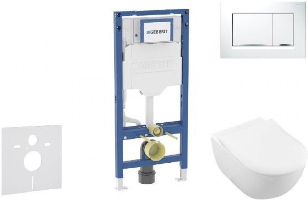 Sada předstěnové instalace, klozetu, WC sedátka a ovládacího tlačítka Obsahuje předstěnový instalační modul Geberit Duofix (111.300.00.6), se splachovací nádržkou pod omítku Sigma 12 cm soupravu pro tlumení hluku (SP 156SET) závěsný keramický klozet Villeroy & Boch Subway 2.0, včetně Slim WC sedátka DirectFlush technologie bezokrajového splachování AquaReduct technologie pro úsporu vody CeramicPl...
