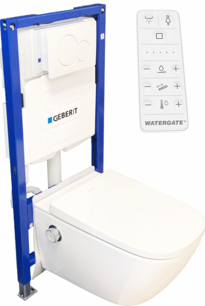 Sprchovací toaleta WATERGATE INTEGRA+ Comfort CUBE s GEBERIT DUOFIX montážním prvkem pro závěsné WC (111.925.00.5), 112 cm, se splachovací nádržkou pod omítku SIGMA 12 cm. Vhodné pro konstrukce prováděné suchým procesem. Montážní prvek GEBERIT DUOFIX 111.925.00.5 nahrazuje starší model 111.300.00.5 - funkčně je identický s drobným vylepšením.