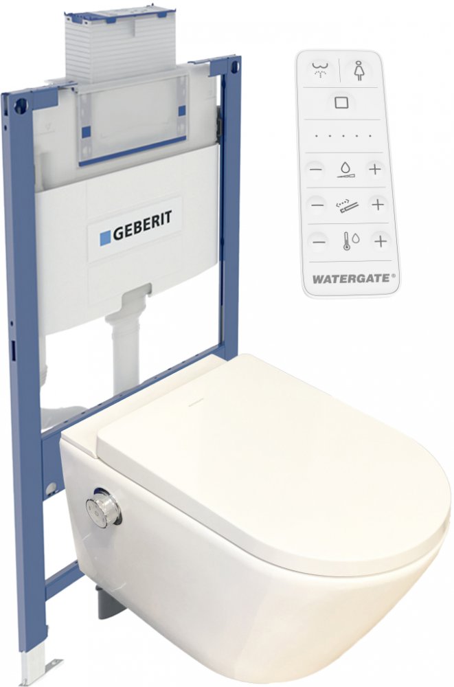 Sprchovací toaleta WATERGATE INTEGRA+ Comfort s GEBERIT DUOFIX montážním prvkem pro závěsné WC, 98 cm, se splachovací nádržkou pod omítku OMEGA 12 cm. Vhodné konstrukce prováděné suchým procesem.