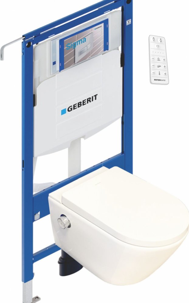 Sprchovací toaleta WATERGATE INTEGRA Comfort s GEBERIT DUOFIX montážním prvkem pro závěsné WC, 112 cm, se splachovací nádržkou pod omítku SIGMA 12 cm. Vhodné konstrukce prováděné suchým procesem.