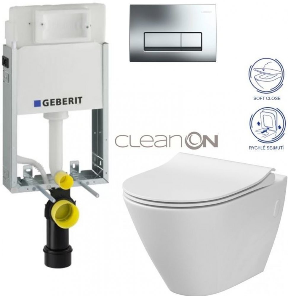 Kombifix KOMBIFIXBasic pro závěsné WC, 108 cm, s nádržkou Delta (110.100.00.1) Účel použití- Pro ovládání zepředu- Pro ovládání pomocí Geberit ovládacích tlačítek Delta- Pro montáž závěsného WC se vzdáleností upevnění 18 cm nebo 23 cm- Pro zabudování mokrým procesem do zděné předstěnové instalace- Pro připojení Geberit AquaClean- Nevhodný pro zabudování do lehkých příček- Nevhodný pro zabetonování Vlastnosti- Geberit Delta splachovací nádržka pod omítku 12 cm (UP100), ovládání zepředu- Splachovací nádržka pod omítku izolovaná proti orosování- Montážní výška 108 cm- Zásuvné upevnění odpadního kolena- Instalační hloubka 12 cm- Pozinkovaný ocelový rám- Nastavitelné velké splachovací množství- Malé splachovací množství pevně nastavené- Přívod vody zezadu / shora uprostřed- Připojovací hadička k rohovému ventilu ručně přišroubovatelnáTechnické informaceSplachovací množství - nastavení z výroby 6 a 3.5 lVelké splachovací množství - rozsah nastavení 4,5 / 6 / 7,5 l Ovládací tlačítko DELTA51, pochromované lesklé (115.105.21.1) - Pro ovládání splachování splachovacích nádržek pod omítku Geberit- Pro ovládání zepředu- Pro Geberit splachovací nádržky pod omítku Delta 12 cm (UP100)- Pro 2 množství splachování WC mísa CITY oválná NEW CLEAN ON (K35-025) Výška: 37 cmŠířka: 36 cmHloubka: 50,5 cmHmotnost: 17,5 kg Závěsná mísa CITY OVÁLNÁ NEW CLEAN ON /bez oplachového kruhu/se zadním odtokem a funkcí splachování 2/4, 2,5/5 a 3/5l. WC sedátko OVAL SLIM antib. OFF EASY (K98-0146) Tenké WC sedátko SLIM s pomalým zavíráním SOFT CLOSE, s jednoduchým sejmutím a upevněním sedátka pomocí jednoho tlačítka EASY OFF ONE BUTTON. 36 x 44,2cm duroplast