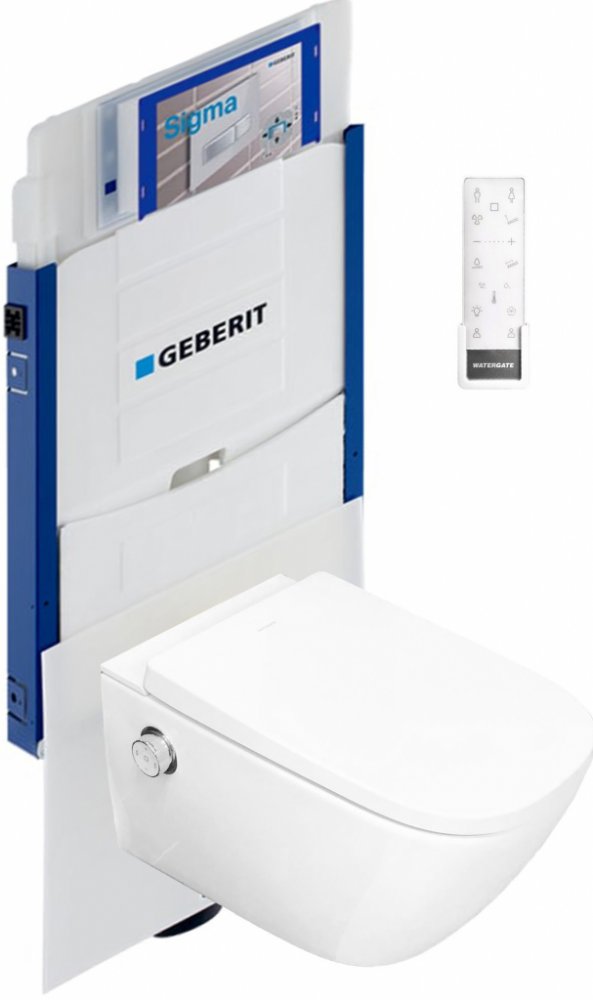 Sprchovací toaleta WATERGATE INTEGRA Premium CUBE s GEBERIT KOMBIFIX montážním prvkem pro závěsné WC, 108 cm, se splachovací nádržkou pod omítku SIGMA 12 cm. Vhodné konstrukce prováděné mokrým procesem.