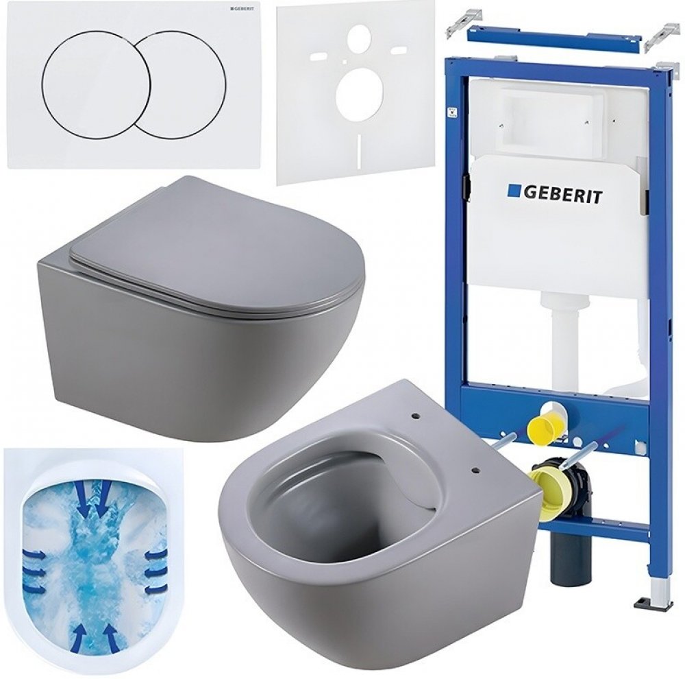 Podomítkový WC set Geberit DuoFix s WC mísou SL-WH-RIM-03 je kompletní řešení pro moderní koupelny, které spojuje elegantní design, funkčnost a vysokou odolnost. Tento set zahrnuje podomítkový instalační rám, závěsnou bezokrajovou WC mísu, zvukoizolační vložku a dvoudílné ovládací tlačítko. Všechny komponenty jsou součástí balení, takže není třeba nic dokupovat zvlášť.