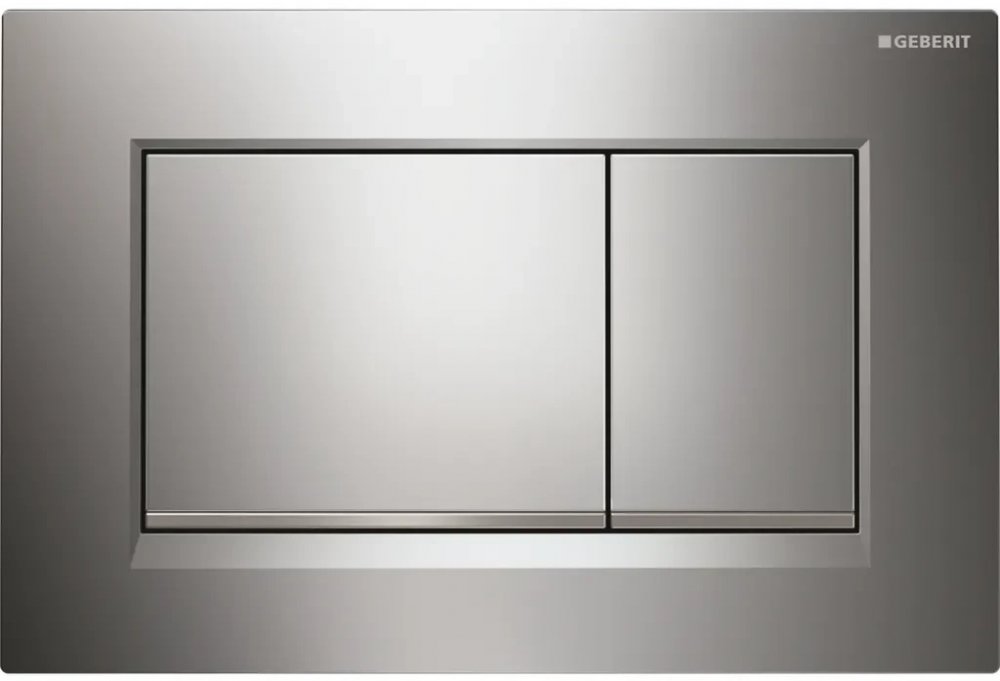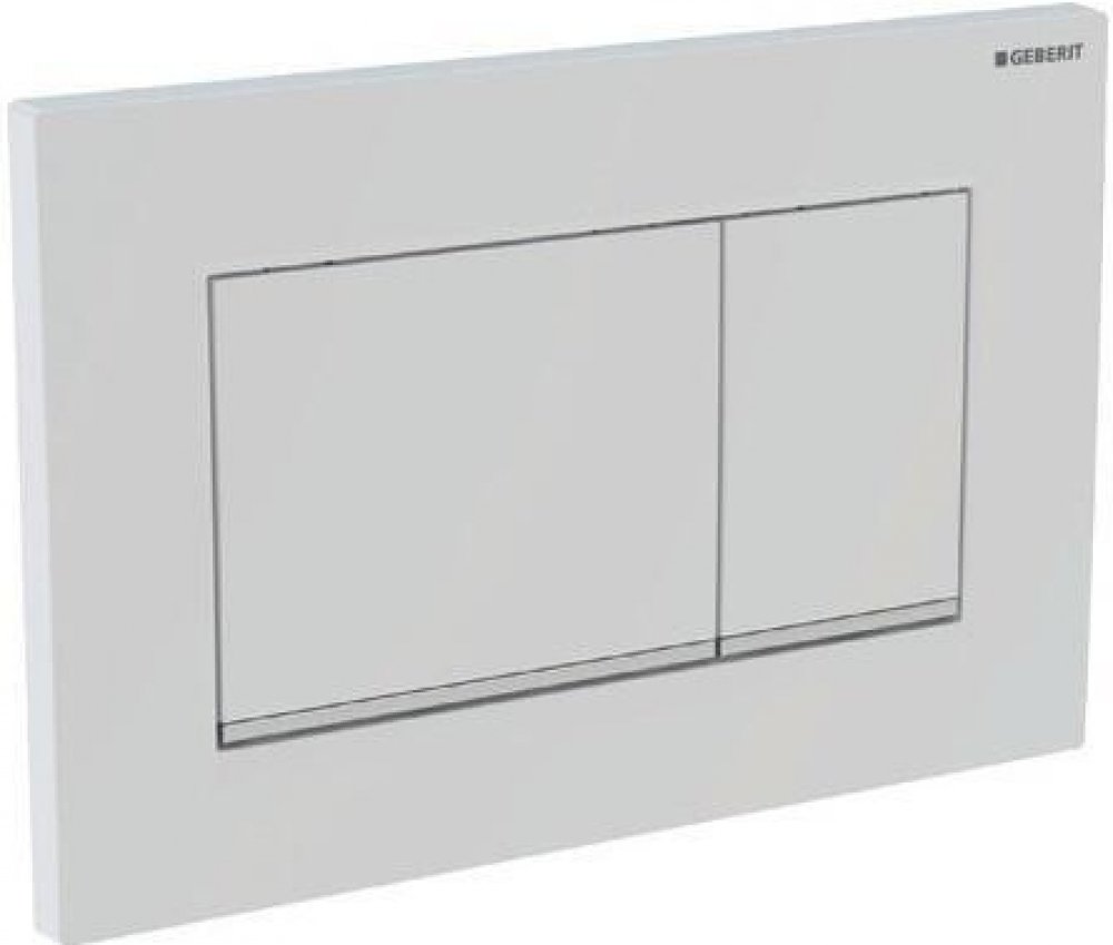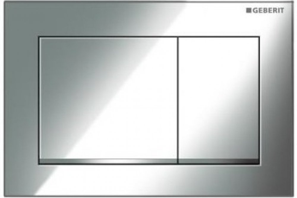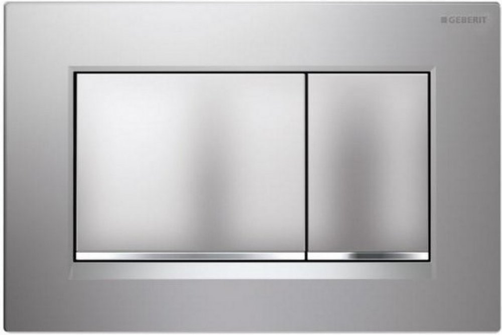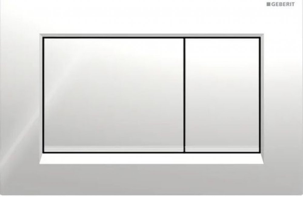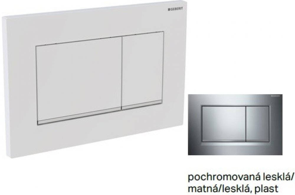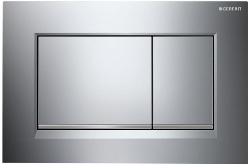 Plastové dvojité ovládací tlačítko Geberit SIGMA30 v barvě lesklý chrom s matným proužkem.