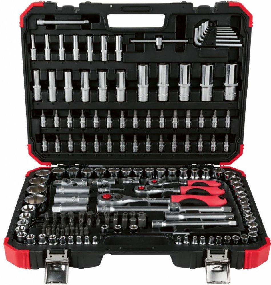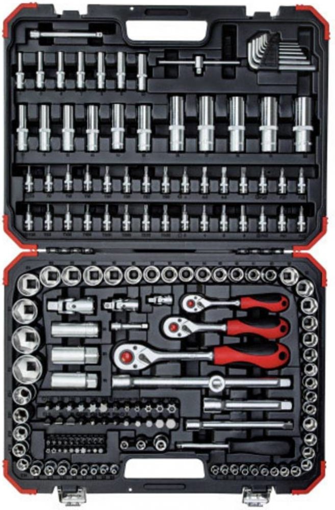 Sada je přehledně organizována v robustním německém kufru, který chrání nástroje před poškozením a umožňuje bezpečný transport. Každá hlavice i nástavec má své přesné místo, což výrazně zrychluje práci a zajišťuje perfektní přehled.