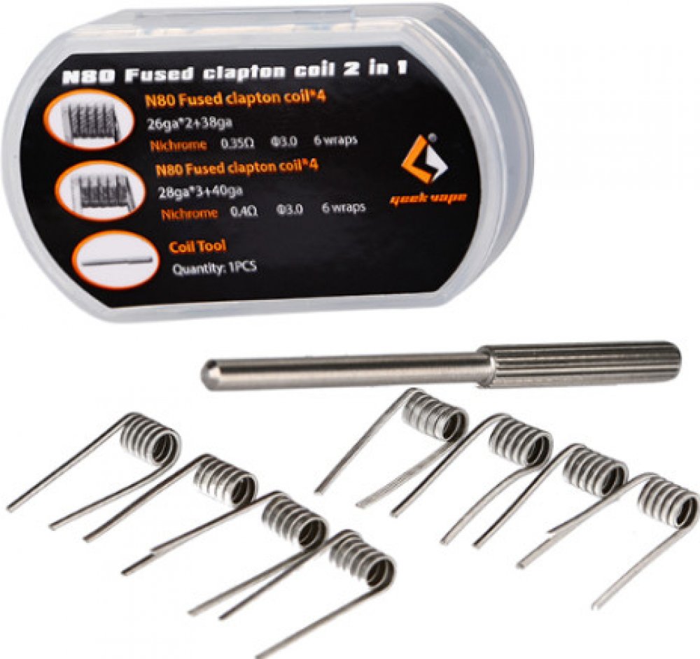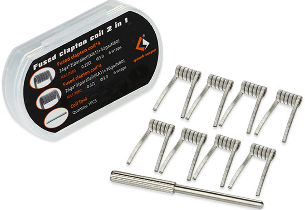 Set 2 v 1 od výrobce GeekVape představuje spirálky typu Fused Clapton. V balení naleznete clapton spirálky s nichromovým jádrem tvořeným několika nichromovými dráty. Jádro je omotáno dalším drátem z Nichromu (Ni80). V balení naleznete rovněž nástroj pro úpravu a motání spirálek. Provedení spirálky: Fused Clapton Odpor spirálek v balení: 0,35 ohm a 0,4 ohm Materiál: Nichrom (N80) + nástroj pro úpravu spirálek z nerezové oceli (SS) Popis balení: 4x Předmotaná spirálka Fused Clapton 28GA*3 (Ni80) + 40GA (Ni80), vnitřní průměr spirálky 3 mm, 6 otoček, odpor 0.4ohm 4x Předmotaná spirálka Fused Clapton 26GA*2 (Ni80) + 38GA (Ni80), vnitřní průměr spirálky 3 mm, 6 otoček, odpor 0.35 ohm 1x Nástroj pro úpravu spirálek, průměr jedné strany 3 mm, délka 30 mm. Průměr druhé strany 4mm, délka 23 mm. Doporučujeme pouze zkušeným uživatelům. Nesprávným použitím může dojít k nevratnému poškození zařízení.