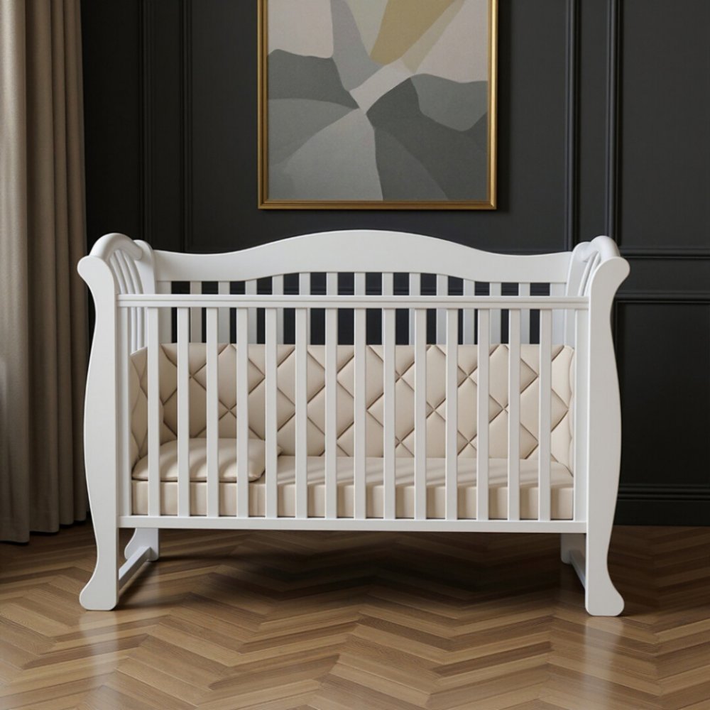 Bezpečný přírodní materiál: Postýlka je vyrobena z prvotřídního přírodního dřeva s bílou povrchovou úpravou. Všechny materiály jsou šetrné k životnímu prostředí a bezpečné pro citlivou pokožku miminka.