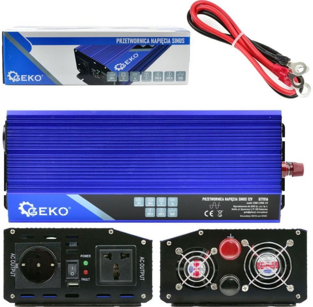 Měnič napětí 12/230V 2000W/4000W, čistá sinusovka GEKO Výkonný měnič napětí s čistou sinusovkou vhodný pro spotřebiče s vysokými nároky na čistý sinusový průběh napájecího napětí. Zařízení je vybaveno USB portem pro napájení a nabíjení mobilních zařízení.