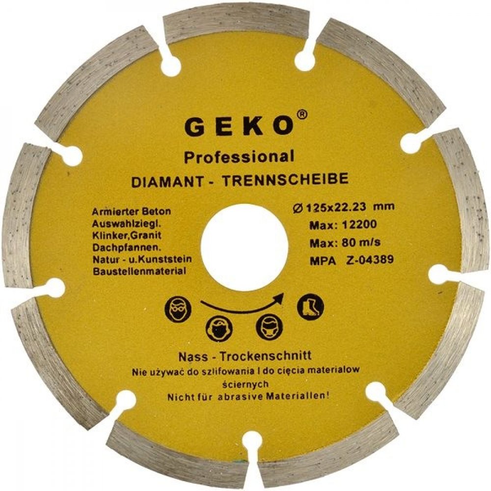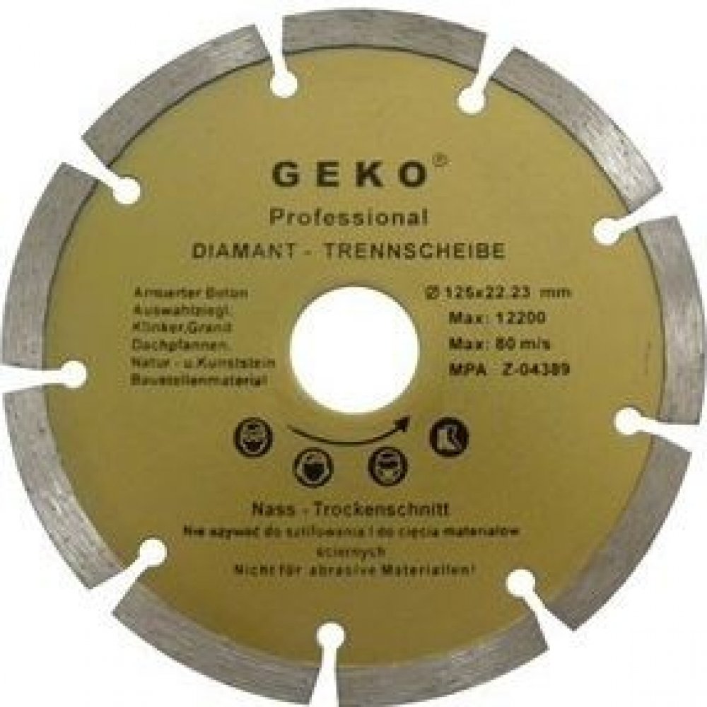 Precizní diamantový řezný kotouč GEKO s přerušovaným diamantovým segmentem po celém obvodu (s drážkami, výřezy), který je rozdělený na určitý počet užších segmentů. Tyto výřezy kotouč během řezání chladí a vynáší obroušený materiál z řezu ven. Segmentový kotouč se hodí pro hluboké řezání tvrdých stavebních materiálů jako je např. beton, železob...