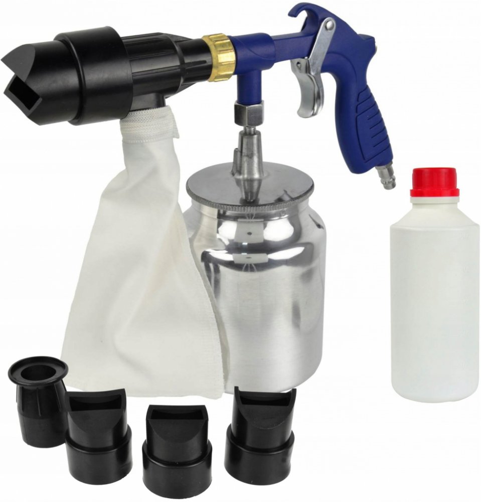 Pro odstranění rzi a zbytků laku na menších plochách, se současnou recyklací pískovacího materiálu. Skříň a sací nádobka z hliníku, textilní sáček na zachytávání pískovacího materiálu, 4 různé pískovací nástavce. Otryskávání s uzavřeným okruhem oběhu abraziva („bezprašná technologie“), jednoduché plnění tryskacího materiálu díky nádobce s bajonetovým závitem. Komplet s namontovanou vsuvkou. Včetně pískovacího materiálu (1kg).