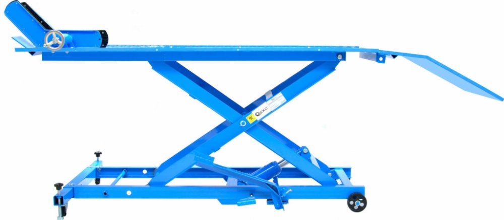Praktický a kvalitní hever na zdvihání a servis motorek. Díky nosnosti 450 kilogramů je vhodný pro širokou škálu strojů provozovaných v našich podmínkách.Jednoduché ovládání: zvedání břemene probíhá pomocí hydraulického systému ovládaného nožní pákou. Odnímatelná zadní nájezdová rampa prodlouží pracovní plochu až na 204 cm (se šikmou částí až na 248 cm).Bezpečné použití: zvedák je vybaven dvoustupňovým bezpečnostním zámkem (výšky 470 a 735 mm) pro případ selhání hydrauliky – hever pak nespadne zcela dolů. Protiskluzová plocha a svorka na přední kolo s nastavitelným rozsahem zaparkovanou motorku účinně stabilizují. Otvory po stranách plošiny umožňují dodatečné zajištění motocyklu šňůrami a popruhy.Snadný transport díky 4 kolečkům – dvě jsou řiditelná (průměr 50 mm), dvě na pevné ose (průměr 100 mm). Pro zvýšení stability je zvedák u řídicích koleček vybaven vyšroubovatelnými stojnami.Povrch je práškově lakovaný. Technické parametry:- max. nosnost: 450 kg- min. výška: 210 mm- max. výška: 825 mm- rozteč držáku předního kola: 168 mm- délka s nájezdovou rampou: 2480 mm- délka bez nájezdové rampy: 1800 mm- užitná šířka plošiny: 640 mm- 2stupňový výškový zámek: 470 mm a 735 mm- rozměry základny: 1545 x 940 mm- hmotnost: 133 kg