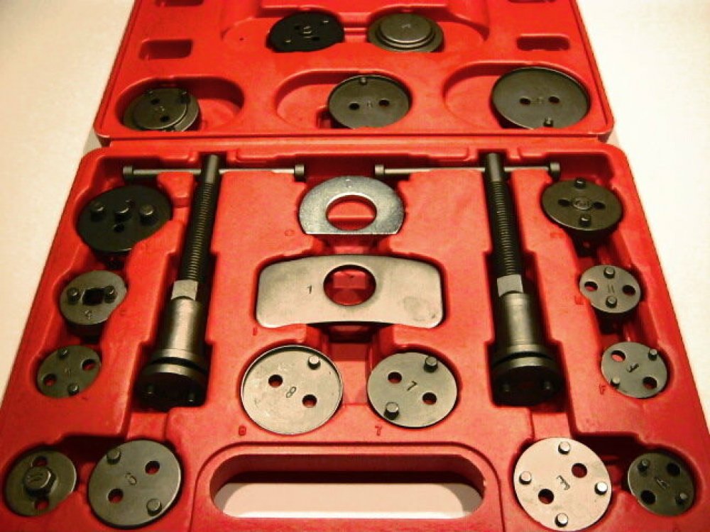 Sada přípravků na výměnu brzd. destiček P+L (21ks) Pomocí této sady snadno zatlačíme jak přední brzdové pístky, tak především zadní, které mají i šroubovici pro ruční brzdu, kdy je třeba na pístek zároveň tlačit i otáčet, univerzální sada v plastovém kufříku slouží pro montáž a zpětné vracení pístů třmenu kotoučových brzd, sada obsahuje 17x adaptér, 2x doraz, 2x tlačný šroub, u vozidel s třmeny kotoučových brzd a...