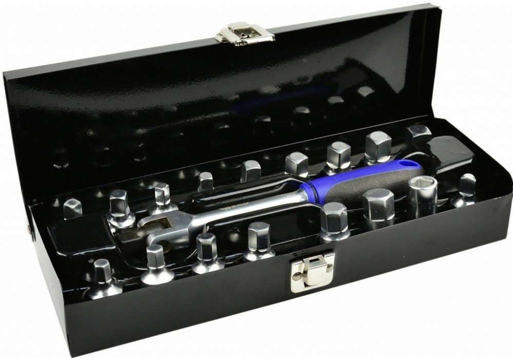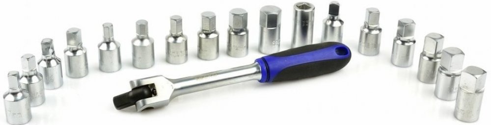 Sada specializovaných hlavic pro vyšroubování vypouštěcích zátek v olejových vanách. Sada obsahuje 18 ks zástrčných hlavic 3/8” a 3/8” kloubový klíč. Všechny prvky sady jsou vyrobeny z odolné nástrojové CrV oceli. Celá sada je umístěna v praktickém kovovém pouzdře.