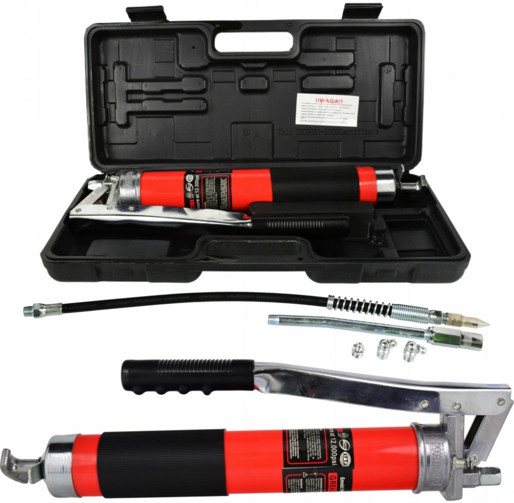 Odolná červená mazací pistole značky GEKO, dodávaná v praktickém kufříku. Tato mazací pistole vytváří tlak až 12 000 PSI, díky čemuž je ideální pro těžký průmysl. Krátký zdvih umožňuje její použití v oblastech s omezeným prostorem.