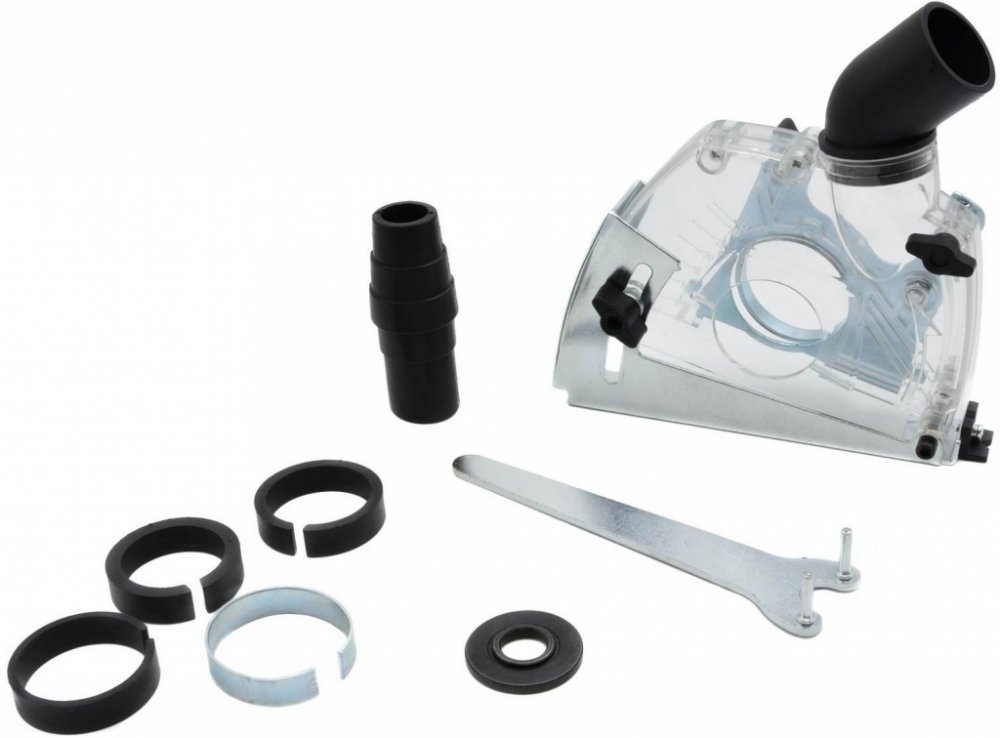 Protiprachový kryt se sacím připojením pro úhlové brusky 115 a 125 mm. Kryt je připevněn k přírubě vřetena namísto standardního kovového krytu.