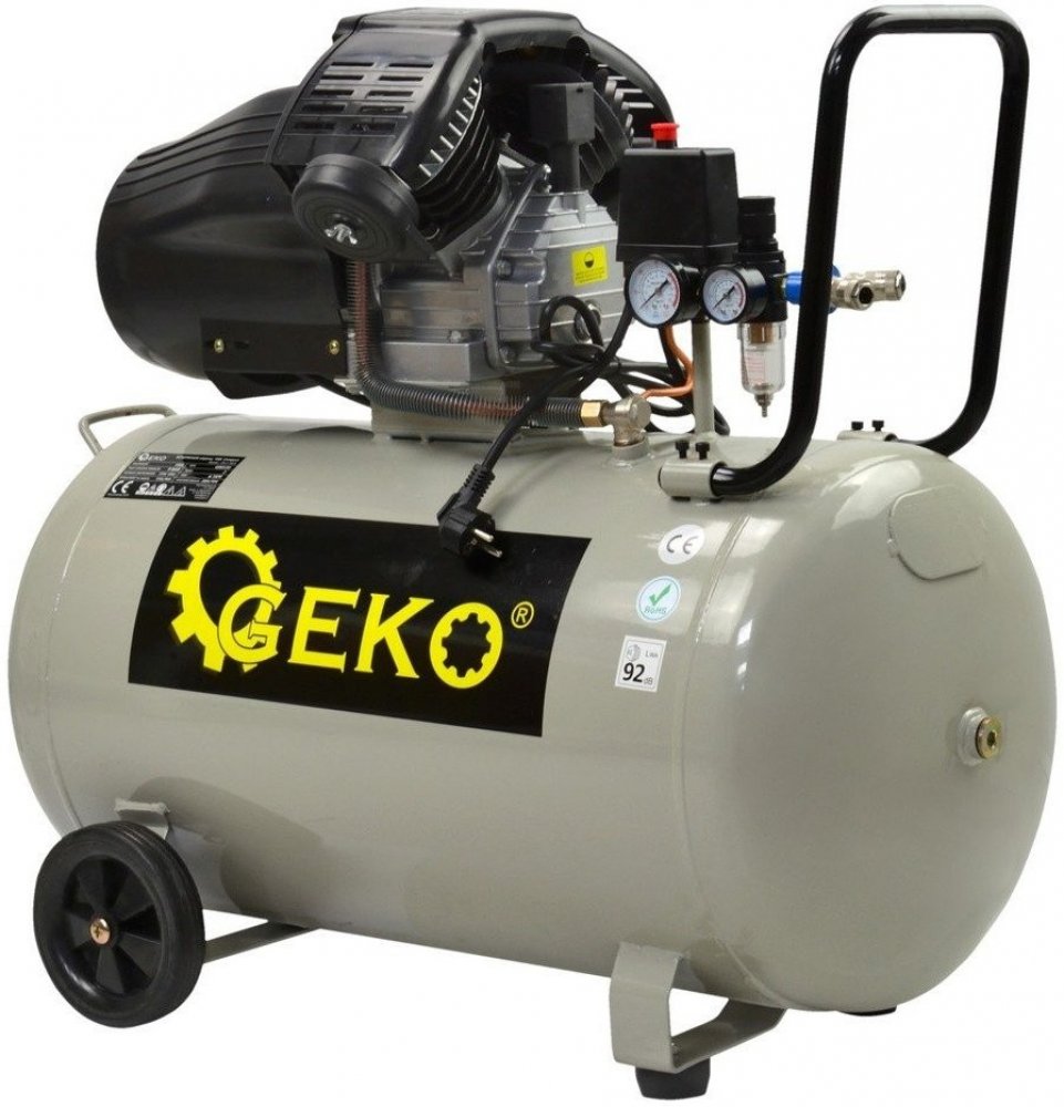 Dvouválcový, řemenový, olejový vzduchový tzv. „V“ kompresor GEKO G80330 Moderní kompresor klasické konstrukce se stolitrovou nádrží (tzv. vzdušníkem) a dvouválcovým čerpadlem. Je vhodný pro napájení většiny pneumatického – vzduchového nářad ...