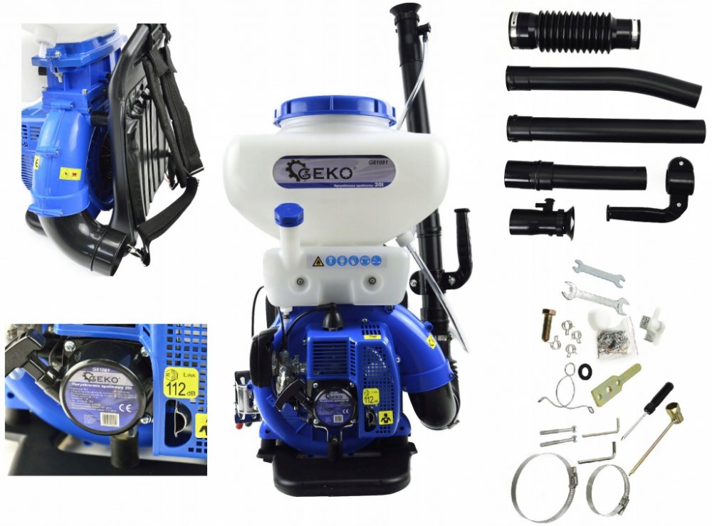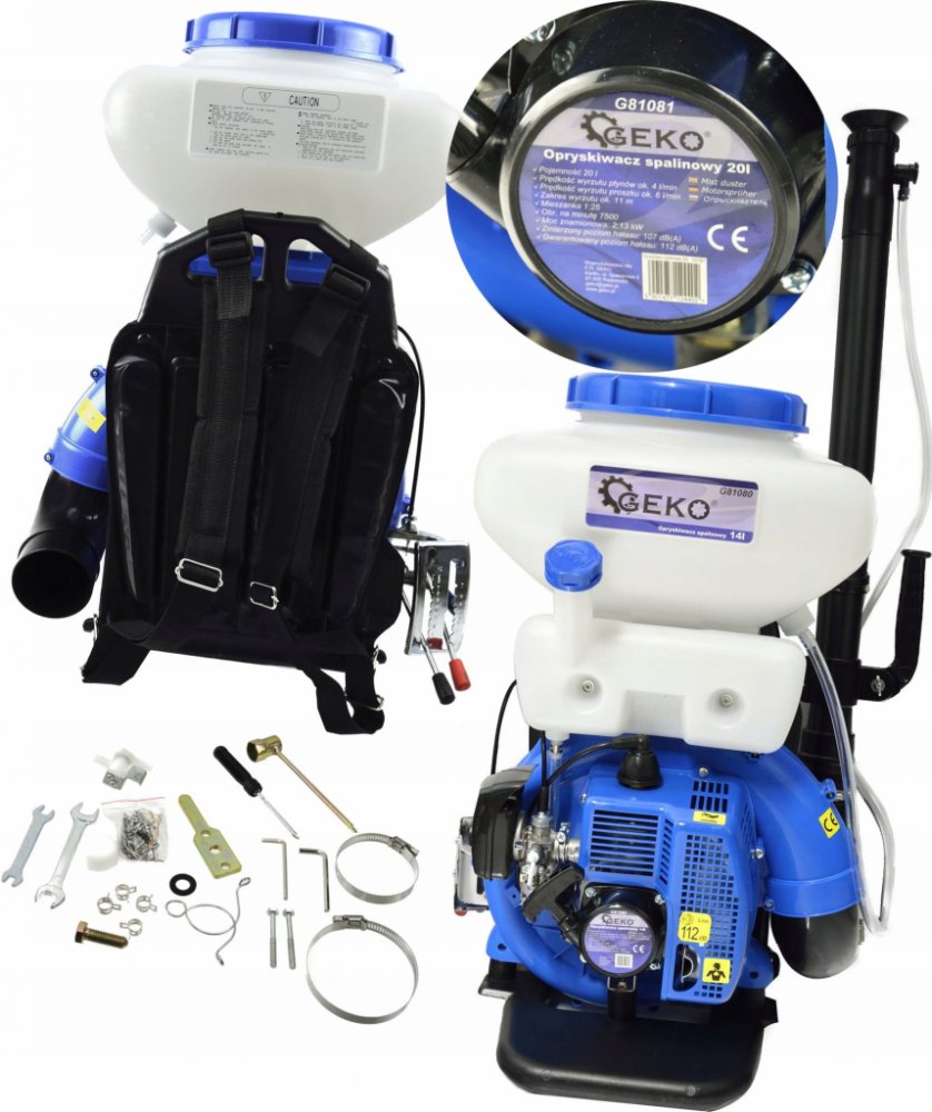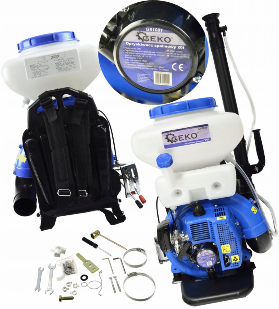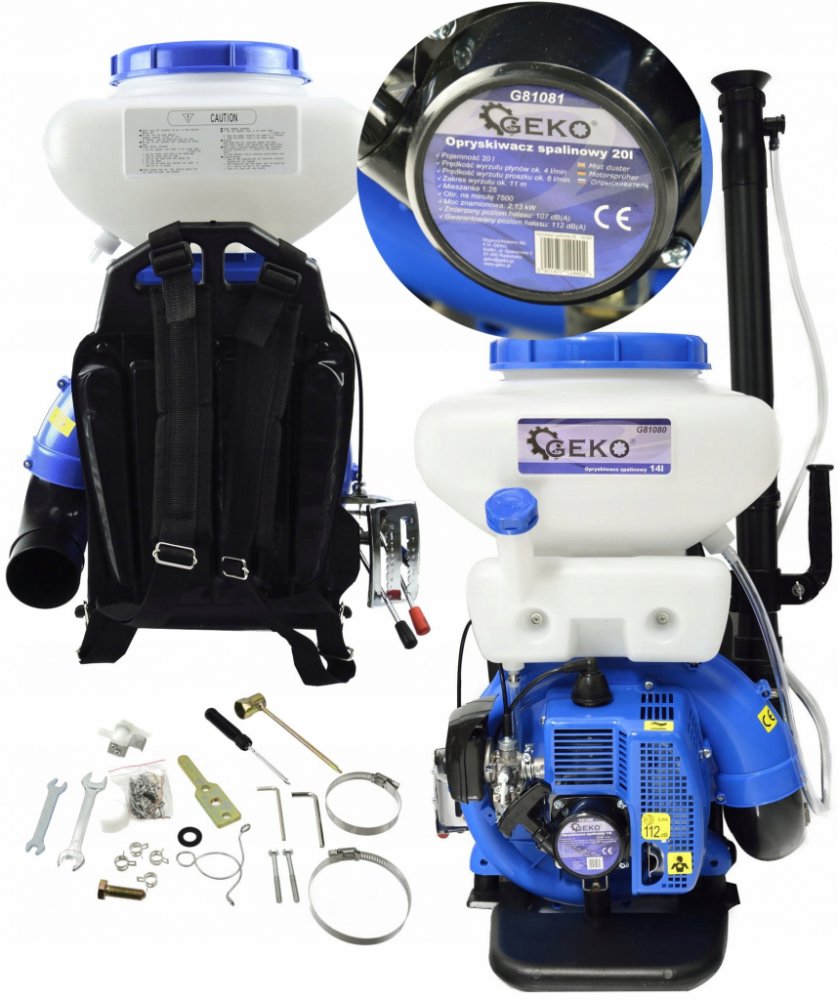 Praktický motorový zádový zahradní postřikovač GEKO je přenosný, flexibilní a vysoce účinný pracovní nástroj pro preventivní ochranu rostlin před chorobami a škůdci. Tento 20litrový zádový postřikovač lze použít při prevenci chorob rostlin a hubení škůdců na velkých plantážích a obdělávaných polích s obilovinami, v zahradách s květinami, ovocnými stromy, stromy čaj...