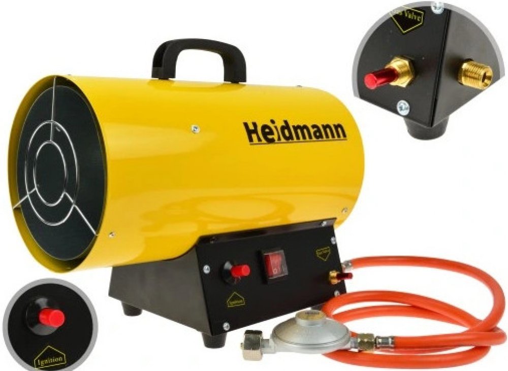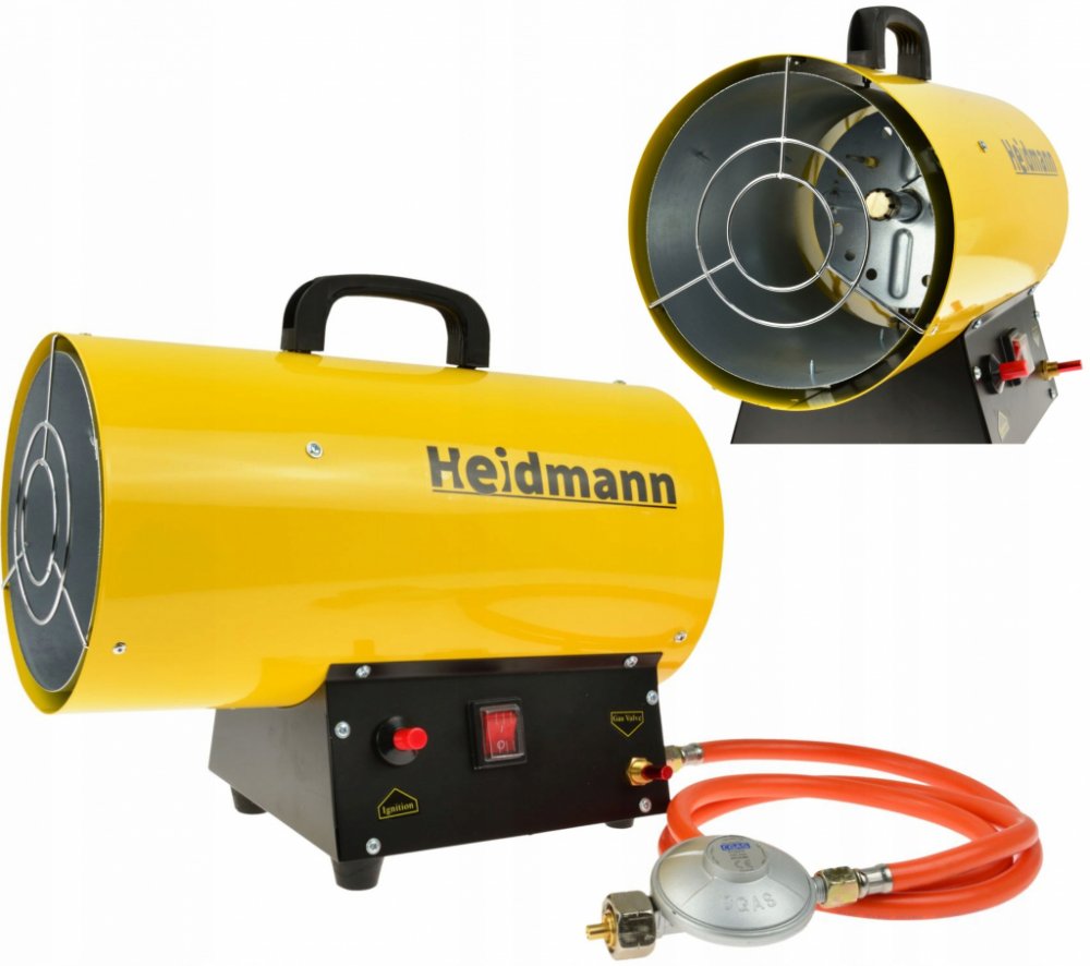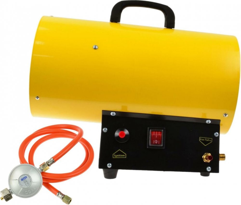 Tento vysoce účinný a pečlivě zpracovaný plynový ohřívač má jednoduchou konstrukci, je vybaven zabudovaným piezoelektrickým zapalováním a zařízením na ochranu před přehřátím, které přerušuje přívod plynu a zaručuje tak bezpečný provoz. Ohřívač může být připojen k 5 nebo 11kg plynové láhvi na propan / butan. Plynový ohřívač se hodí pro vytápění dílen, hal, skladů atp. Redukční ventil a gumová hadice o délce 1550 mm jsou součástí standardní výbavy ohřívače.