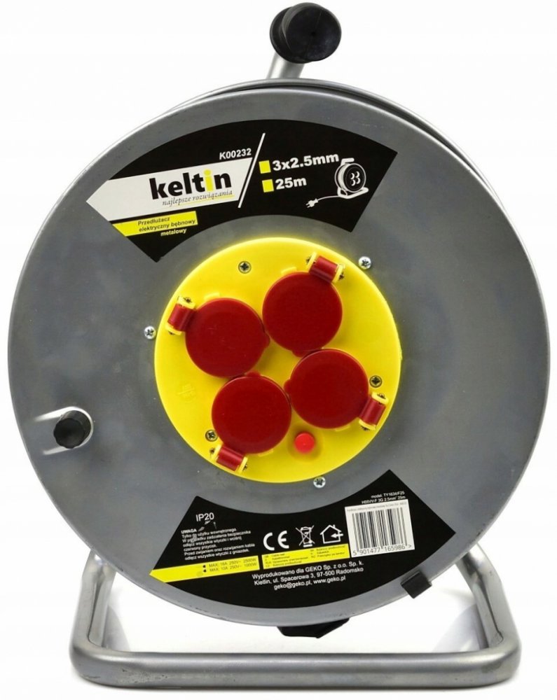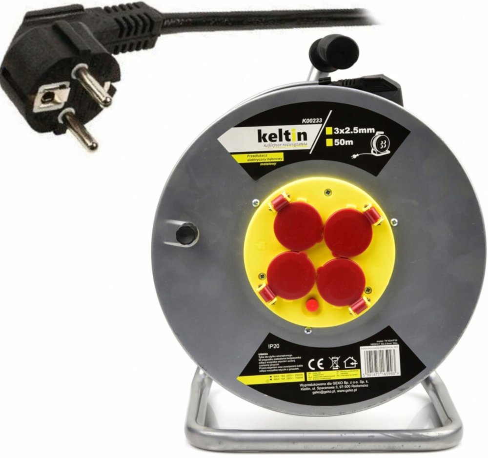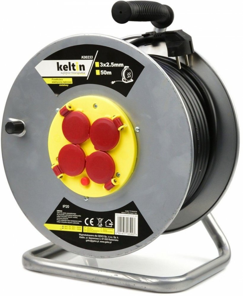 Osvědčený elektrický prodlužovací kabel KELTIN s kovovým navijákem a délkou 50 m.