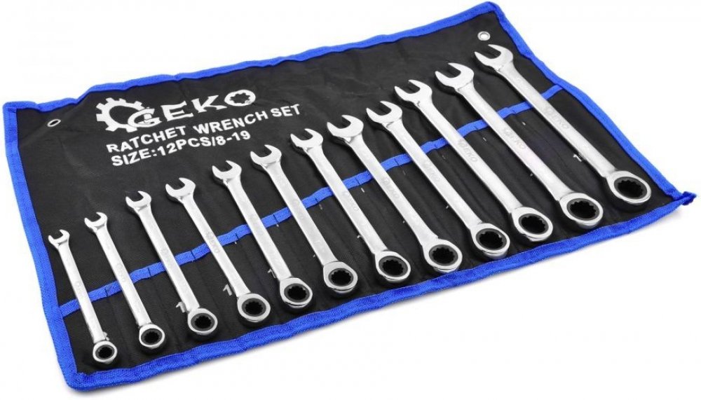 G10343 Balení: Hmotnost: 1.800 Délka: 32.00 Šířka: 12.00 Výška: 5.00 Popis: Klíče očkoploché ráčnové sada 12 ks 8 - 19mm GEKOSada očkoplochých klíčů s ráčnou 8-19mm z chromvanadiové oceli (CrV). Uplatní se v profesionálních autodílnách i v domácí garáži. Klíče jsou dodávány v praktickém obalu, který lze zavěsit na zeď. Ráčnový klíč může úspěšně nahradit profesionální rychloupínací ráčnu a zároveň má mnohem menší velikost - umožňuje přístup do těsných míst.Sada obsahuje:12 klíčů ve velikostech 8, 9, 10, 11, 12, 13, 14, 15, 16, 17, 18, 19 mm