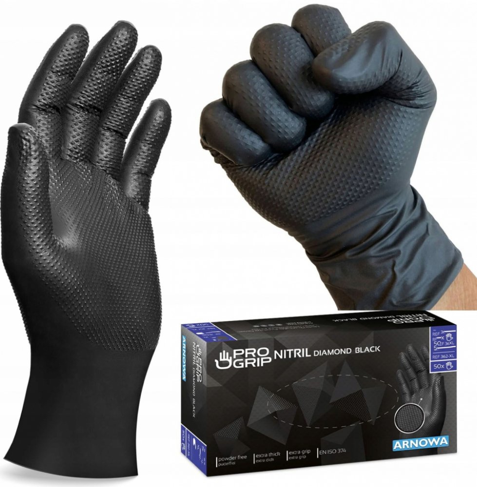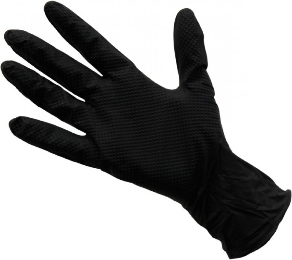 Nitrilové rukavice G75200 v černé barvě s diamantovou texturou, která zajišťuje vynikající úchop a ochranu rukou při práci v náročném prostředí. 3D diamantová textura zároveň umožňuje cirkulaci vzduchu uvnitř rukavice a poskytuje tak dodatečný komfort při práci. Větší tloušťka materiálu v úchopové části zvyšuje odolnost proti poškození. Rukavice jsou odolné proti vybraným chemickým látkám. Nitrilové rukavice jsou perfektní pro uživatele s citlivou pokožkou či pokožkou náchylnou k alergiím, protože neobsahují latexové proteiny.