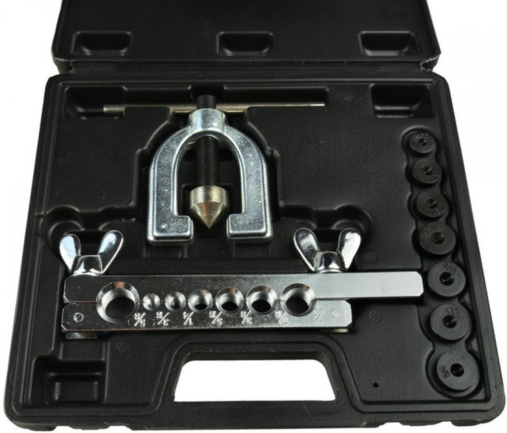 Pertlovací sada na brzdové trubky 9 ks Pertlovací sada na brzdové trubky se používá na běžné 90° pertlování i otevřeného " F " a dvojitého " E ", na potrubí s tloušťkou stěny do 1 mm. Čelisti jsou o průměru 5-6-8-10 mm.Vhodná na měděné a hliníkové trubky. Sada obsahuje:7 adaptérů: 3/16", 1/4", 5/16", 3/8", 7/16", 1/2", 5/8"matrice s otvory: 3/16", 1/4", 5/16", 3/8", 7/16", 1/2", 5/8"kuželový hrot se 45° hrotem