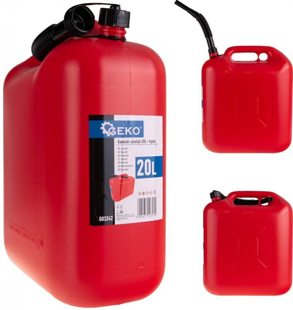 Plastový kanystr 20 l + nálevka (2)Plastový kanystr o objemu 20 litrů. Má držadlo pro přenášení a k nádobě přišroubovaný výtokový trychtýř. Určený pro palivo, oleje a vodu. Kanystr splňuje normy (certifikát) 3H1/Y/150/18/PL COBRO 1649/HGB. Ověřeno zákazníky