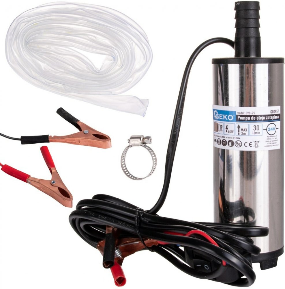 ⚙️ Technické údajeUniverzální použití: Tato ponorná 24V pumpa značky Geko byla navržena pro čerpání oleje a hydraulických kapalin, díky čemuž je práce s nimi mnohem snazší a efektivnější.Vysoký výkon: Díky výkonu 30 l/min a příkonu 60 W čerpadlo rychle a efektivně přečerpává kapaliny, čímž šetří váš čas a energii.Velký zdvih: Čerpadlo může čerpat kapaliny do výšky až 3 metry, což z něj činí ideální nástroj pro použití jak doma, tak v garáži nebo dílně.Odolná konstrukce: Robustní konstrukce a vysoká kvalita zpracování zajišťují spolehlivost a odolnost i při intenzivním používání.Pohodlný kabel: Kabel o délce 3 metry vám dává volnost při manipulaci s pumpou a umožňuje flexibilní použití zařízení v různých podmínkách.Dlouhá průhledná hadice: Součástí balení je průhledná hadice k čerpadlu o délce 3 metry.Značka: GekoNapětí: 24 VVýkon: 60 WVýkon: 30 l/minVýška zdvihu: 3 mDélka kabelu: 3 mPřipojení hadice: 19 mmOtáčky: 8500 ot./minPrůhledná hadice o délce 3 m Popis a použitíCharakteristika:Univerzální použití: Tato ponorná 24V pumpa značky Geko byla navržena pro čerpání oleje a hydraulických kapalin, díky čemuž je práce s nimi mnohem snazší a efektivnější.Vysoký výkon: Díky výkonu 30 l/min a příkonu 60 W čerpadlo rychle a efektivně přečerpává kapaliny, čímž šetří váš čas a energii.Velký zdvih: Čerpadlo může čerpat kapaliny do výšky až 3 metry, což z něj činí ideální nástroj pro použití jak doma, tak v garáži nebo dílně.Odolná konstrukce: Robustní konstrukce a vysoká kvalita zpracování zajišťují spolehlivost a odolnost i při intenzivním používání.Pohodlný kabel: Kabel o délce 3 metry vám dává volnost při manipulaci s pumpou a umožňuje flexibilní použití zařízení v různých podmínkách.Dlouhá průhledná hadice: Součástí balení je průhledná hadice k čerpadlu o délce 3 metry.Technické specifikace:Značka: GekoNapětí: 24 VVýkon: 60 WVýkon: 30 l/minVýška zdvihu: 3 mDélka kabelu: 3 mPřipojení hadice: 19 mmOtáčky: 8500 ot./minSoučástí balení:ČerpadloPrůhledná hadice o délce 3 mHydraulická spona Obsah balení / SETNářadí dle popisuPříslušenství dle varianty (pokud je uvedeno)Návod k použití❓ Často kladené dotazy (FAQ)Je výrobek vhodný pro domácí použití?Ano, podle typu výrobeku je vhodný pro hobby i profesionální použití – vždy záleží na zátěži a správném použití.Je součástí balení příslušenství?Ano, obsah balení je uveden v sekci SET nebo v popisu výrobeku.Jaká je záruka?Standardní zákonná záruka 24 měsíců (pro firmy dle platné legislativy).Máte dotaz k výběru?U nás se dovoláš – rádi poradíme s výběrem i kompatibilitou.❗ Obrázky jsou ilustrační a mohou se lišit dle dodávky.Nevíte si rady? Ozvěte se – rádi vám poradíme!