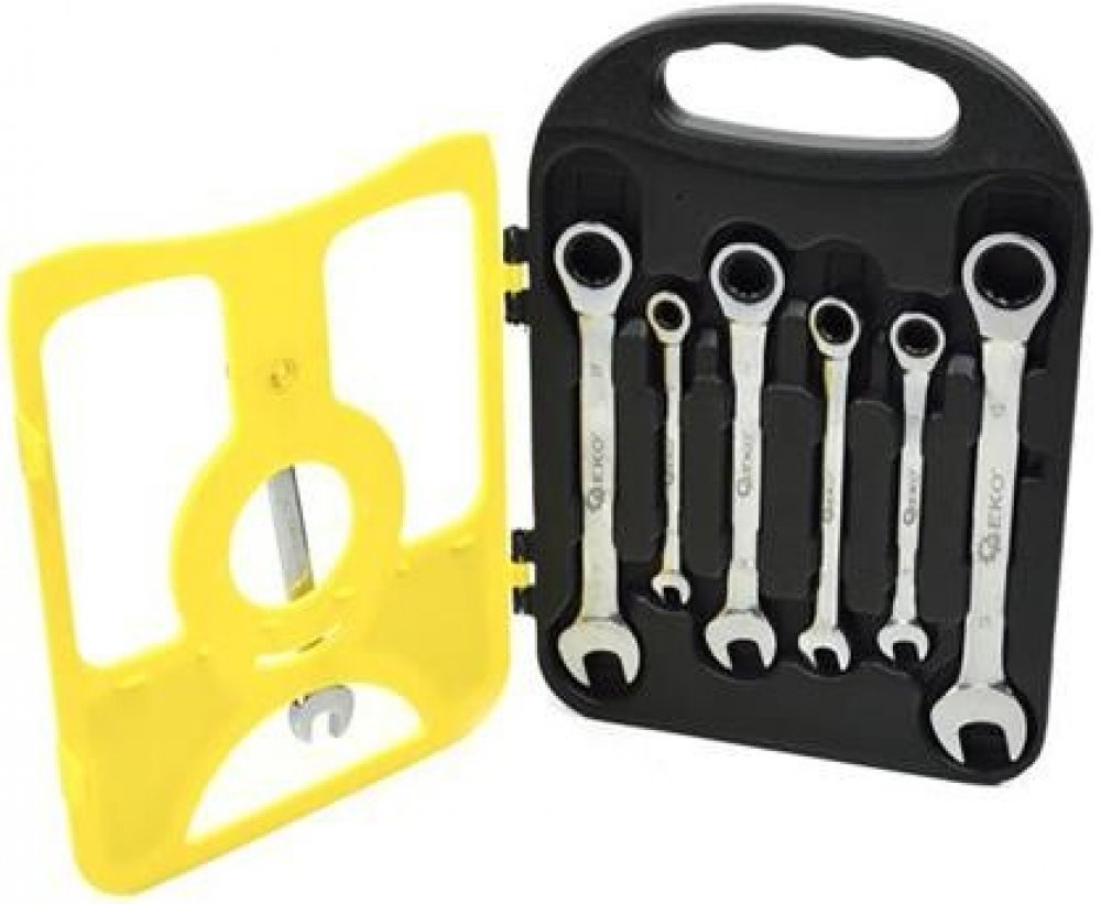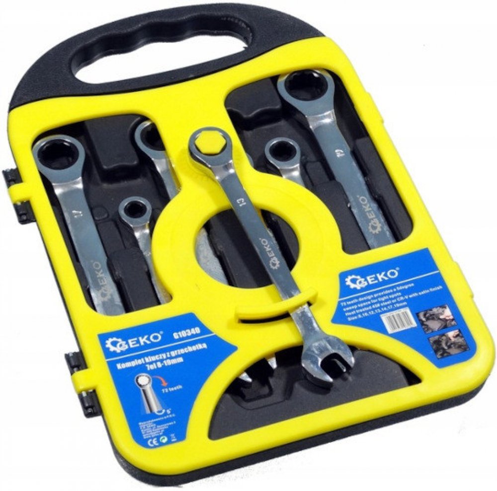Sada ráčnových klíčů 8-19mm vyrobených z odolné chrom-vanadové oceli (CrV).Klíče jsou v praktickém plastovém obalu, který lze zavěsit na stěnu.