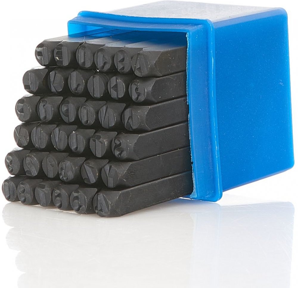 Razící matrice písmen a čísel, sada 36 ks, 6 mm - GEKO G01816 Pro trvalé značení jednotlivých prvků a částí, pomocí kladiva se do předmětu vyrazí vybraný symbol. Sada obsahuje 36 kusů razících matric a je balena v praktické plastové krabičce. Obsah sady: Písmena: A, B, C, D, E, F, G, H, I, J, K, L, M, N, O, Q, P, R, S, T, U, V, W, Y, Z, X. Znaky a číslice: &, 0, 1, 2, 3, 4, 5, 6, 7, 8.