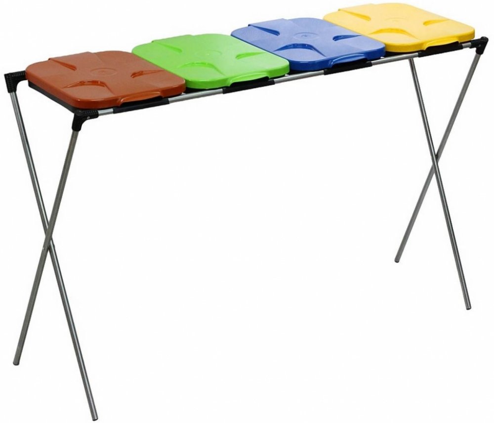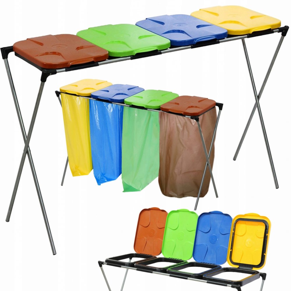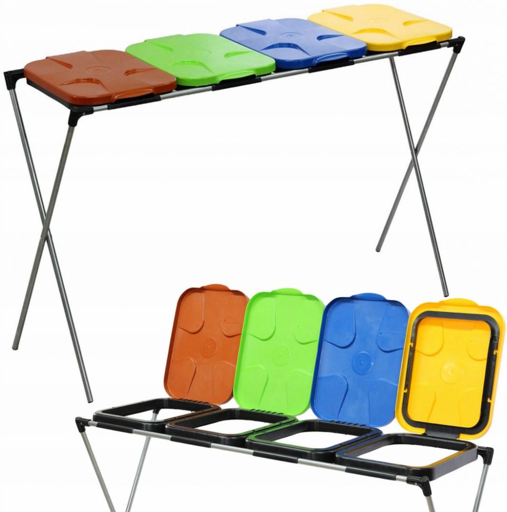 Stojan má žlutý, modrý, zelený a hnědý plastový poklop. Vhodné pro pytle, sáčky o objemu 120 až 240 litrů.