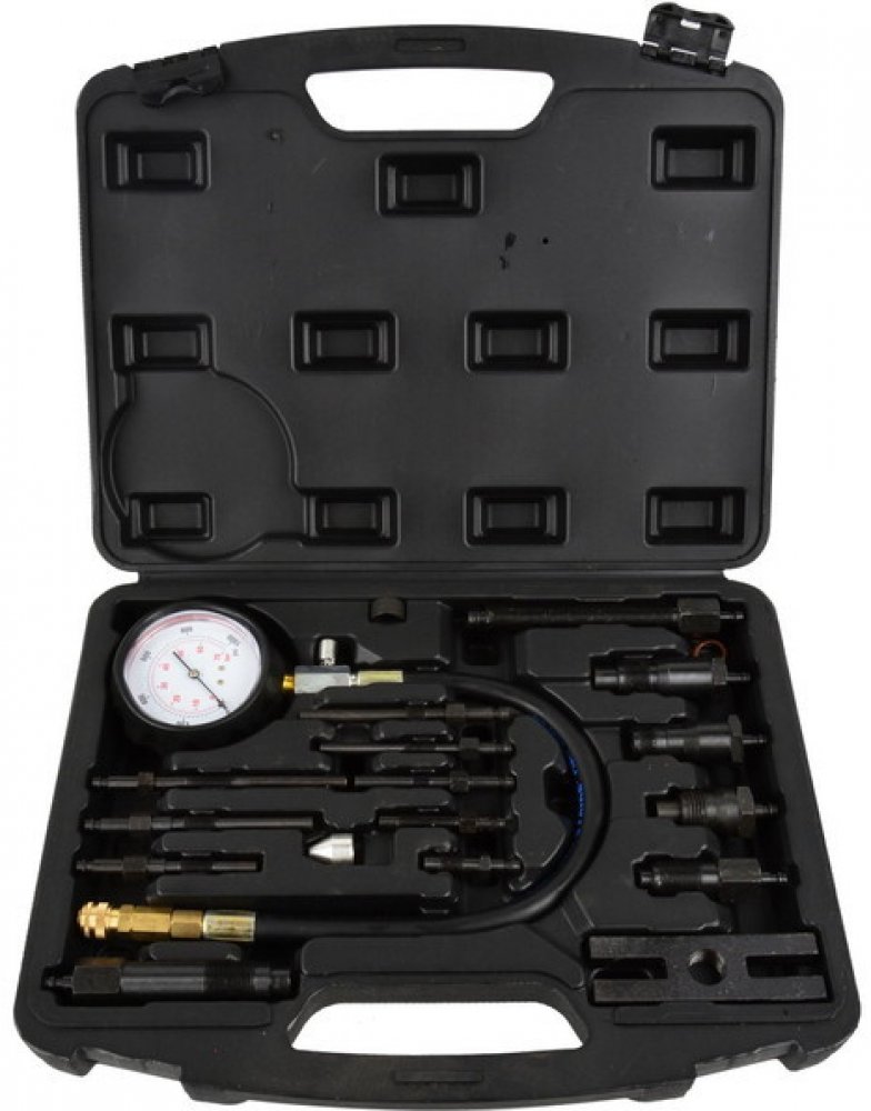 Tester, měřič komprese pro naftové motory 17 ksMěřič komprese pro měření tlaku ve válcích naftových motorů pro osobní, lehké úžitkové automobily, některé nákladní automobily a autobusy. Pro různé typy motorů ( aut, nákladních vozidel, lodních motorů apod.)Sada obsahuje :Manometr 0 - 70 BAR (0-1000PSI)Gumová hadice (délka 500 mm) s rychlospojkou pro napojení adaptérůZpětný ventil, obsahuje připojov...