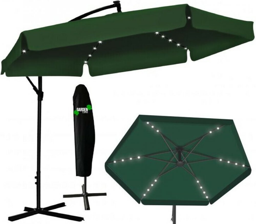 Zahradní slunečník 3m, zelený, Banana s LED osvětlením a obalemElegantní a praktický zahradní slunečník je ideální volbou pro vaše venkovní prostory během jara a léta. Ať už pořádáte rodinné setkání, grilování s přáteli, nebo si jen užíváte chvíli klidu s knihou, poskytne vám příjemný stín a spolehlivou ochranu před sluncem. Slunečník je vyroben z kvalitních materiálů a vybaven LED osvětlením napájeným solární energií, které vytváří příjemnou večerní atmosféru. Díky rozměrům 3 × 3 metry zajišťuje dostatečně široký záběr stínu. Stabilitu garantují speciální otvory v základně. Potah z voděodolného polyesteru chrání slunečník před nepříznivým počasím a prodlužuje jeho životnost. Ocelová základna s práškovou povrchovou úpravou a praktická klika umožňují snadné rozkládání i složení.Technické údaje:Barva: zelenáPrůměr kopule: 300 cmPrůměr po materiálu: 350 cmVýška slunečníku: 250 cmProdlužena noha podnožkyDélka podnožky: 100 cmKopule: polyester s hustotou 180 g/m2Ocelový profil s práškovou povrchovou úpravouPrůměr profilu: 48 mm/42 × 1 mm6 ocelových žeber: 12 × 18 × 0,5 mm