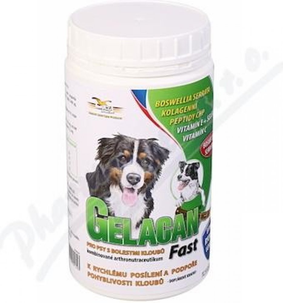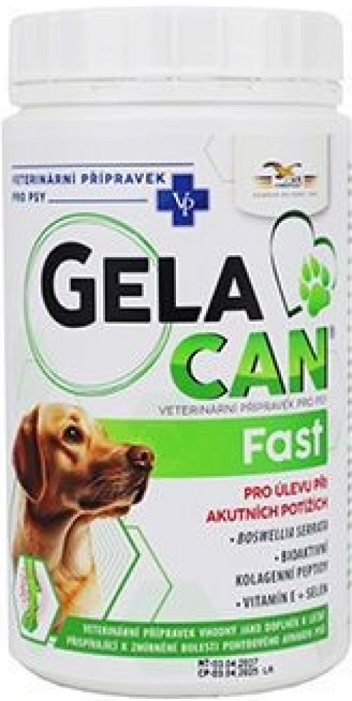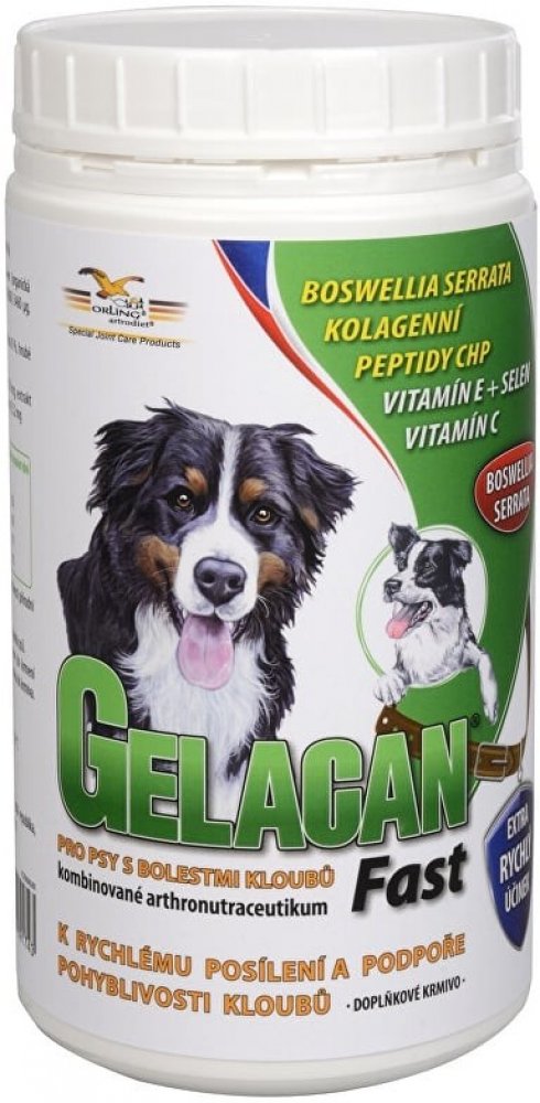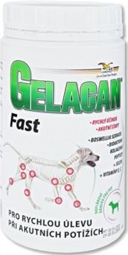 GELACAN FAST - KLOUBY - AKUTNÍ BOLESTIVÝ STAV Doplňkové krmivo s Boswellií Serratou, kolagenními peptidy CHP, vitamíny E, C a selenem vhodné k akutní aplikaci při bolestivosti pohybového aparátu psů. Gelacan Fast obsahuje komplex účinných složek pozitivně ovlivňujících zánětlivé procesy v kloubních, šlachových a vazivových tkáních, zvyšujících kloubní pohyblivost a omezujících bolestivost kloubů v klidu i při pohybu. Boswellie Serrata je originální bylinná formule s vysokým obsahem boswellových kyselin k rychlému zvýšení flexibility kloubů a elasticity pohybu. Obsahuje bylinné extrakty vykazující protizánětlivé a analgetické účinky, obnovující krevní cévy a zlepšující krevní oběh a výživu postižených tkání. Důsledkem působení účinných látek Boswellie Serraty je zmírnění bolestivosti, snížení otoků a zvýšení pohyblivosti kloubů. Účinné látky pomáhají při akutním postižení i chronických zánětech. Potlačují proliferaci tkání při zánětu a potlačují odbourávání pojivových tkání. Mechanismus účinku je podobný jako u nesteroidních antirevmatik, avšak bez vedlejších účinků na zažívací trakt. Kolagenní peptidy CHP zvyšují tvorbu kolagenu o 100 %, zmírňují až odstraňují následky poškození kloubů, vazů a šlach. Ovlivňují metabolismus buněk pojivových tkání směrem k syntéze fyziologického typu kolagenu, normalizují jejich činnost a omezují bolestivost. Indikační skupina: doplňkové krmivo - chondroprotektivum Indikace: při akutních potížích pohybového aparátu (kulhání, poranění kloubů, vazů a šlach) při zánětu vazů, šlach a svalů po úrazech a operačních výkonech při ztuhlosti kloubů a u starších psů pro zlepšení pohyblivosti Doporučené dávkování: 1,5 g na 10 kg hmotnosti psa Způsob použití: Podávat denně po dobu minimálně 2 měsíců. Dlouhodobé podávání je možné.