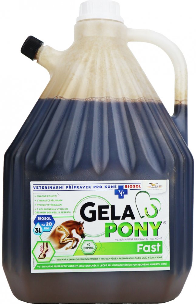 Denní dávku odměřte a přimíchejte ke krmné dávce nebo podejte stříkačkou přímo do huby koně. Před použitím protřepat! Usazenina není na závadu kvality přípravku. Přípravek je vhodné podávat denně po dobu minimálně 10 dní. Přípravek je vhodné podávat denně po dobu minimálně 10 dní. Dlouhodobé podávání Gelapony® Fast je vhodné koním, u kterých se různé pohybové problémy vyskytují opakovaně. Gelapony® Fast Biosol neobsahuje žádné látky považované za doping koní.