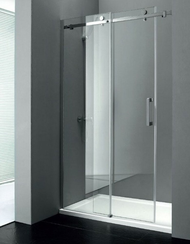 Dveře z bezpečnostního skla jsou zavěšeny a jejich pohyb usměrňuje vodící díl na podlaze. Je tak umožněn bezbariérový vstup.